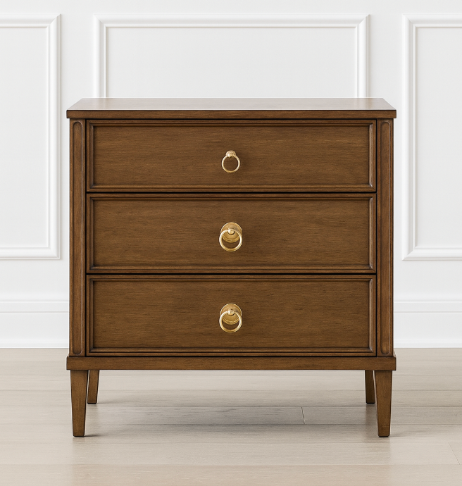 Expertly built from sustainably sourced solid mahogany and premium mahogany veneers, this bedside chest blends minimalist design with exceptional quality. Three drawers glide effortlessly on soft, self-closing undermount glides, providing smooth, quiet functionality and ample storage for everyday essentials. Framed drawer fronts and gently tapered legs add subtle sophistication and structure.