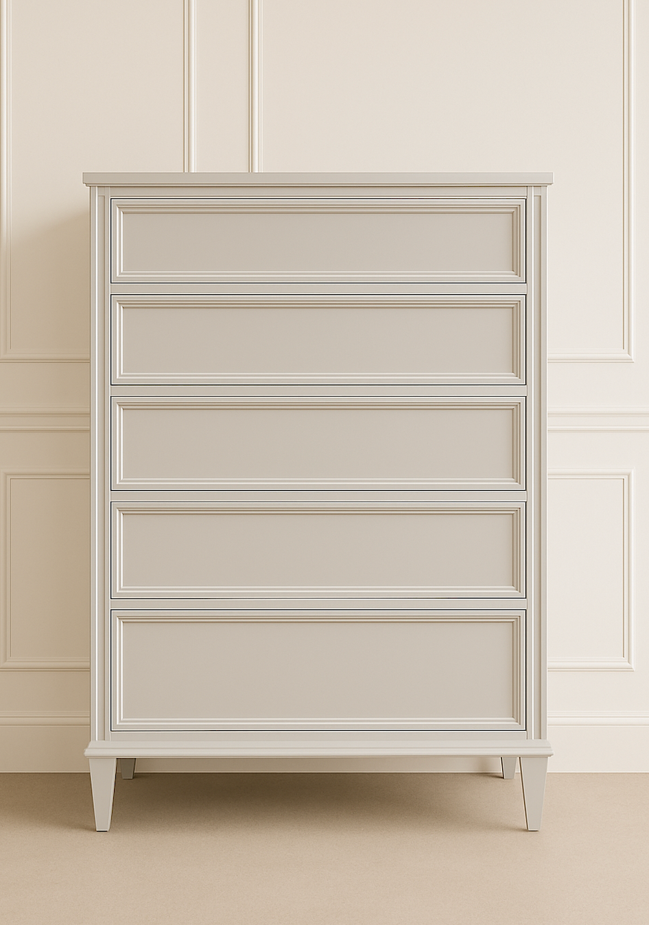 Framed drawer detailing and tapered legs for a refined silhouette