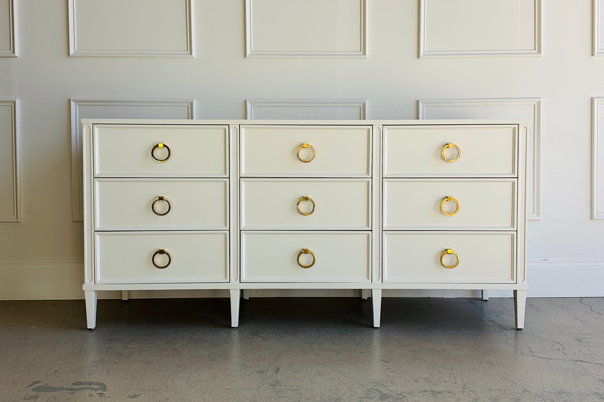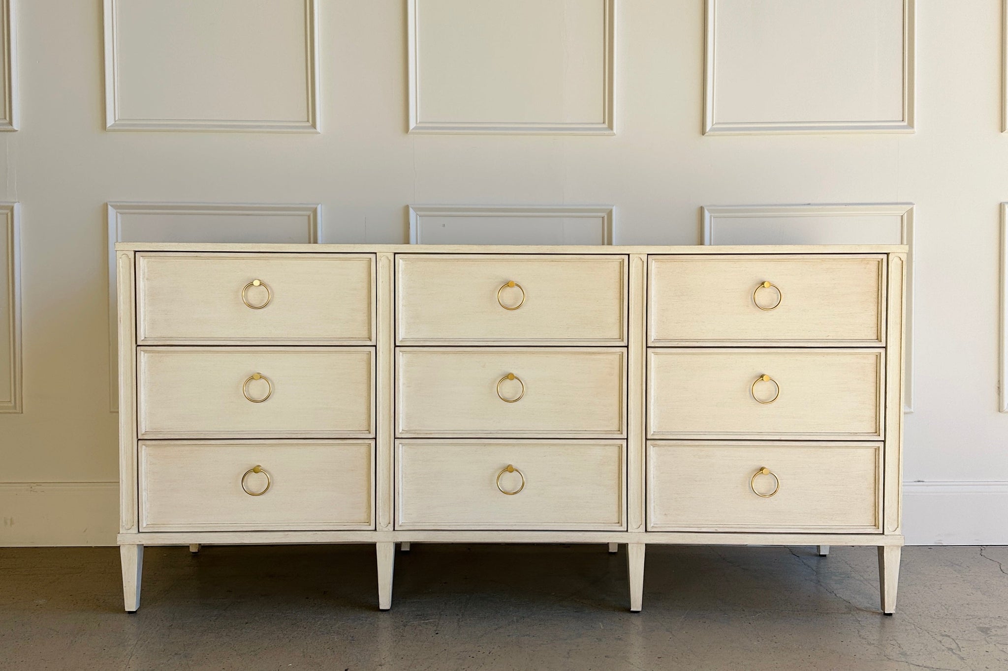 Framed drawer fronts and tapered legs for a refined, architectural look
