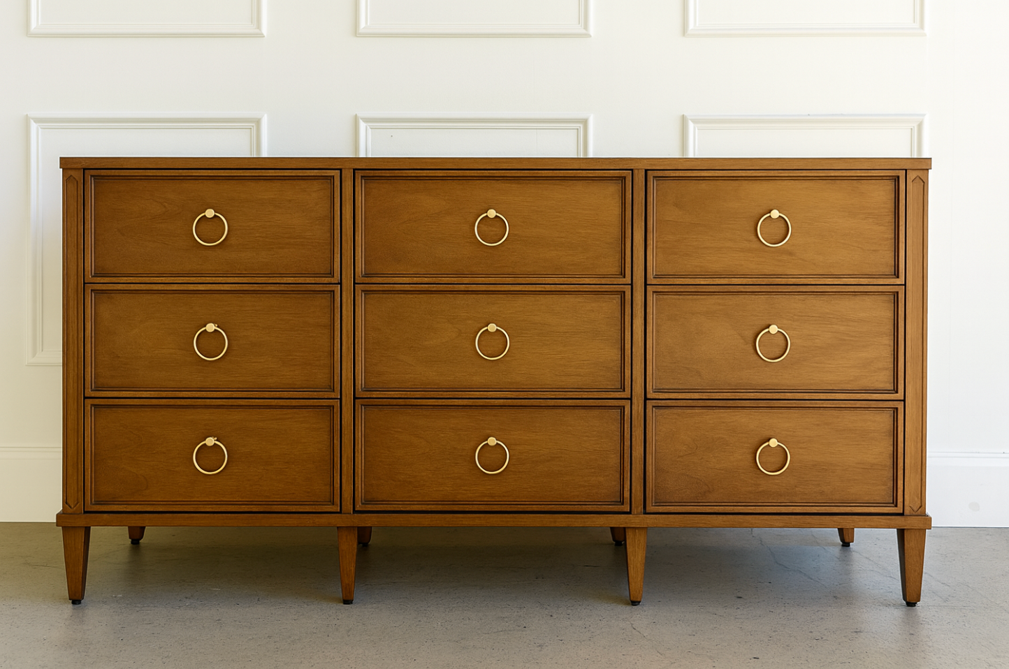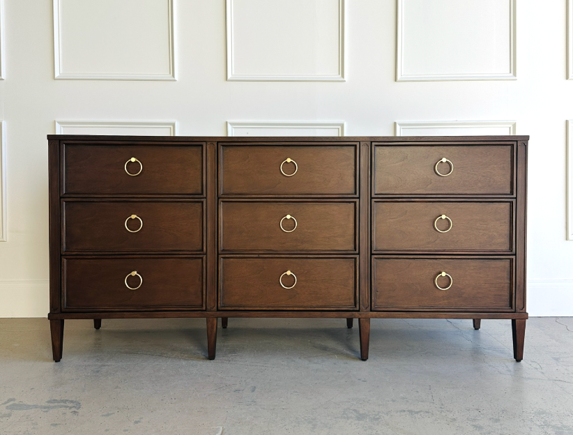 Crafted from sustainably sourced solid mahogany and rich mahogany veneers, this dresser combines visual harmony with everyday practicality. Nine spacious drawers glide effortlessly on soft, self-closing undermount glides, offering smooth operation and generous storage. Framed drawer fronts and slender tapered legs create a refined silhouette that feels both modern and enduring.