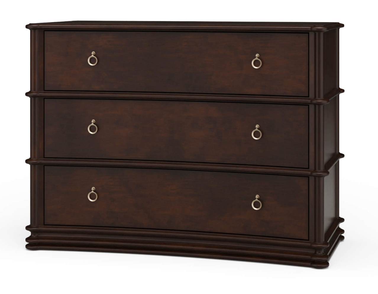 The Battersea 3-Drawer Dresser brings graceful structure and quiet luxury to any room. Handcrafted from solid mahogany, this piece features soft bow-front curves, tiered detailing, and minimalist brass ring pulls that highlight its clean silhouette. The natural finish lets the wood’s warm tone and rich grain take center stage, making this dresser as elegant as it is functional.
