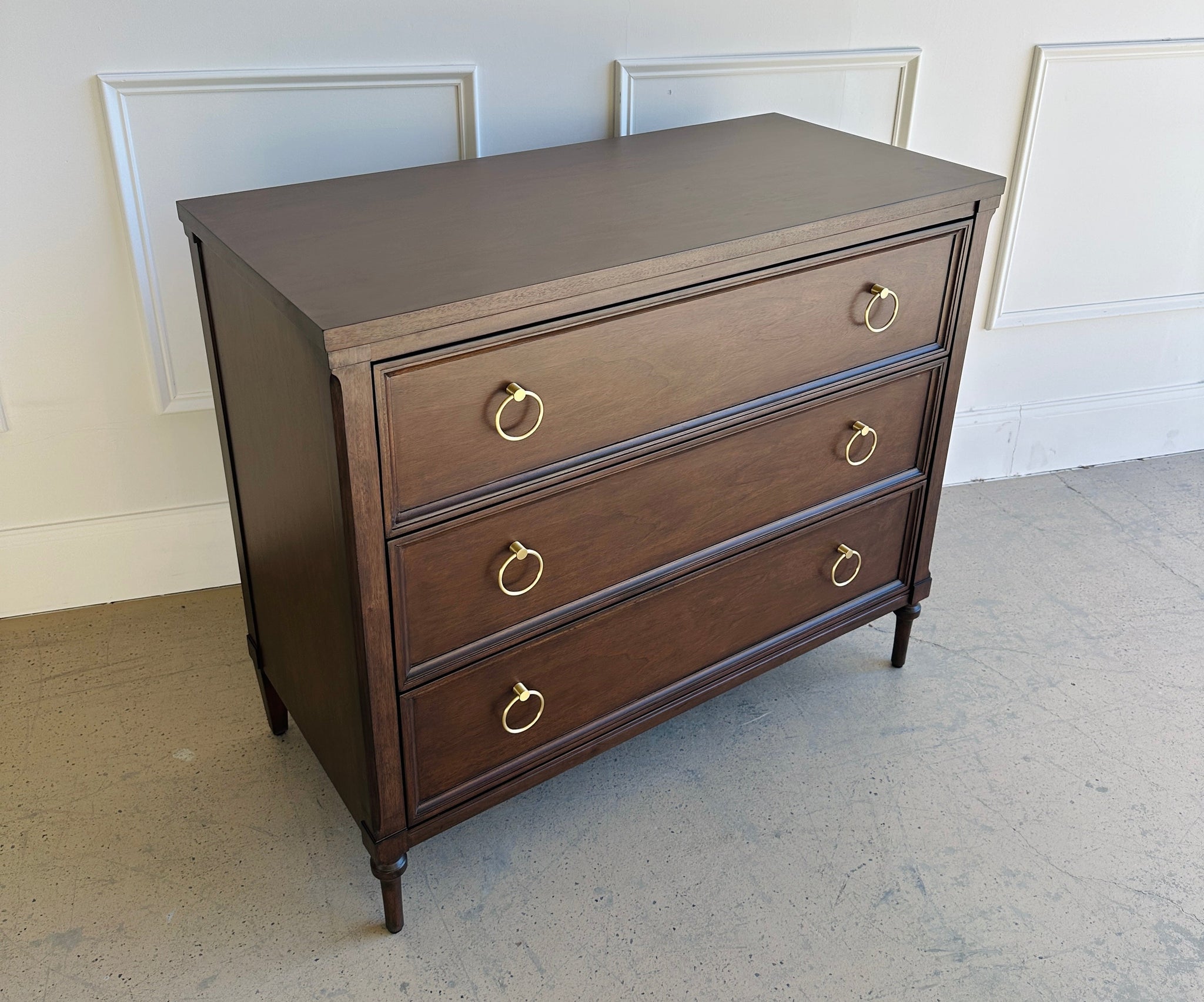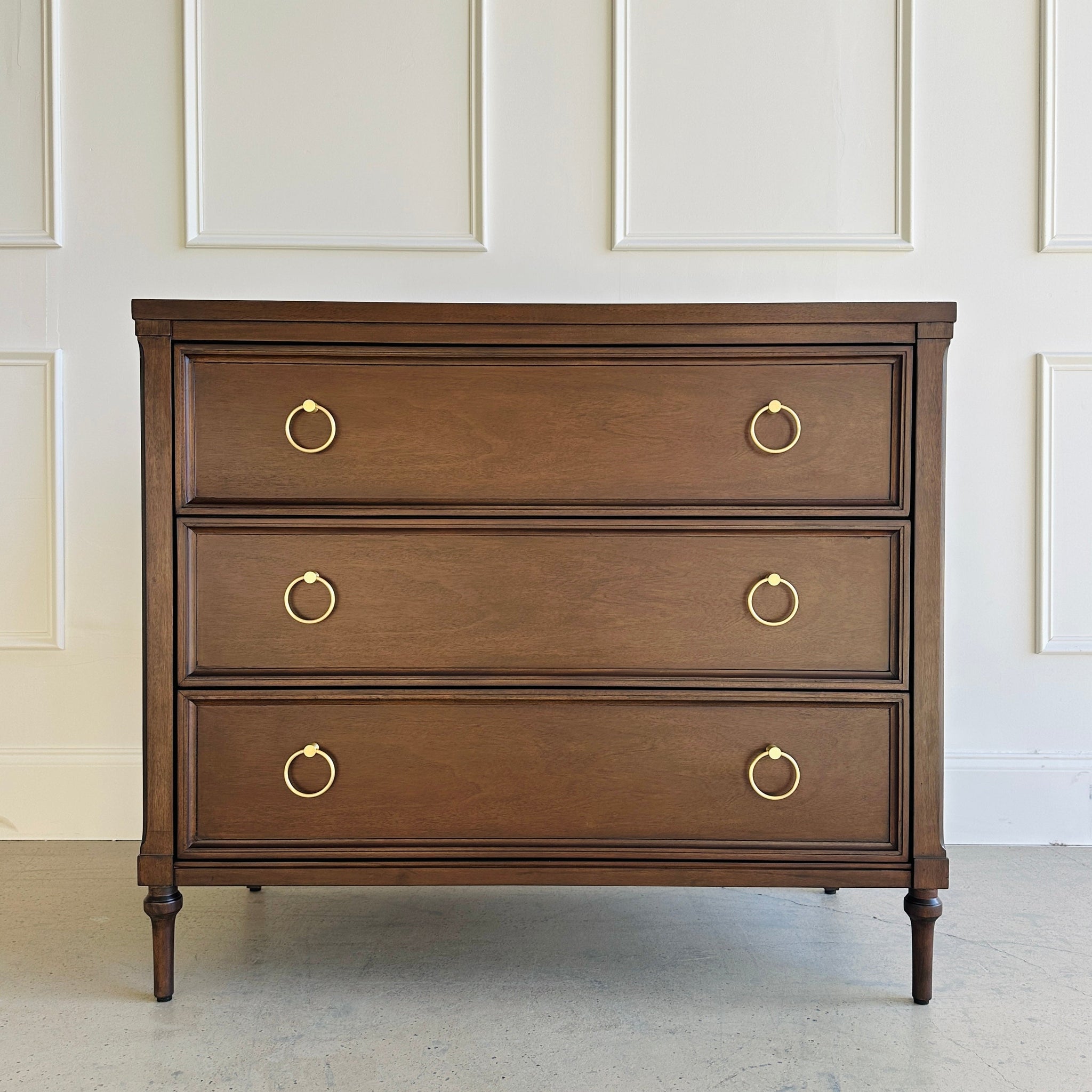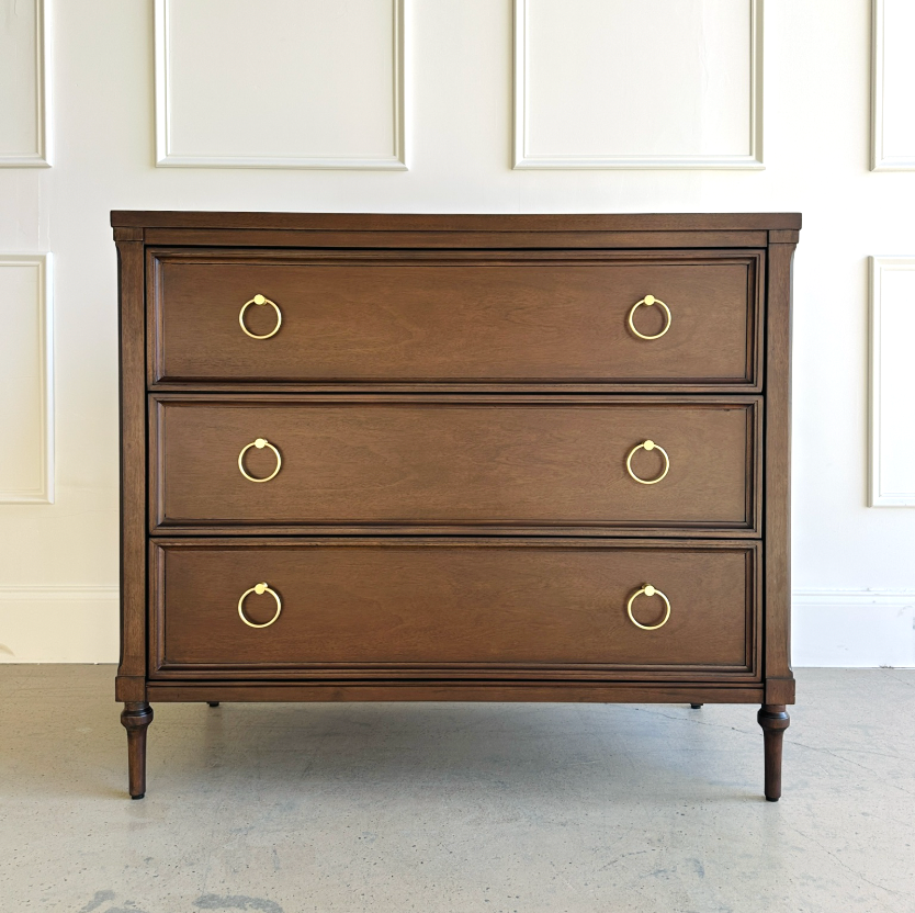Crafted from sustainably sourced solid mahogany and rich mahogany veneers, this chest balances timeless form with modern practicality. Three generously sized drawers glide effortlessly on soft, self-closing undermount glides, offering ideal storage for clothing, linens, or entryway essentials.