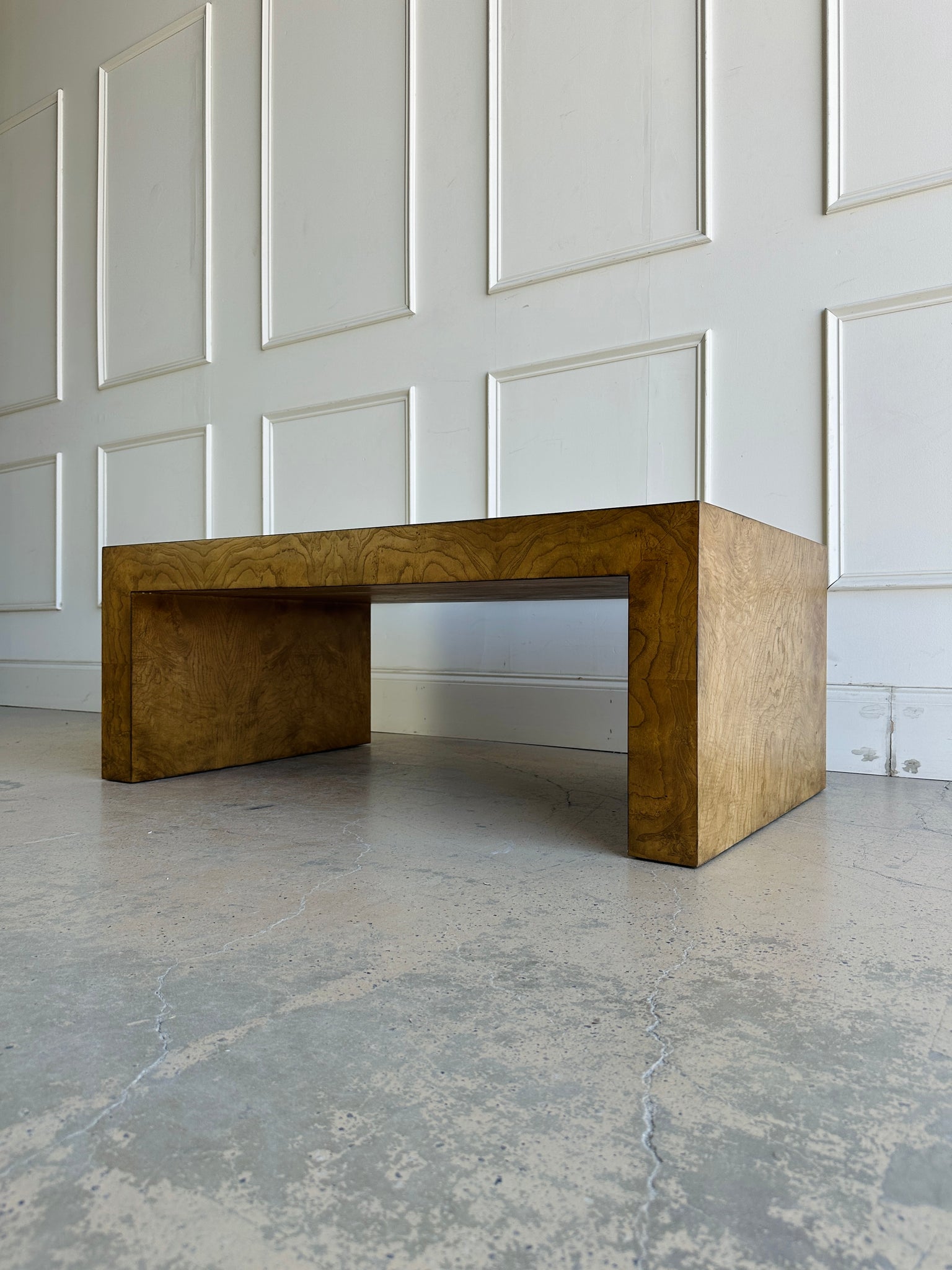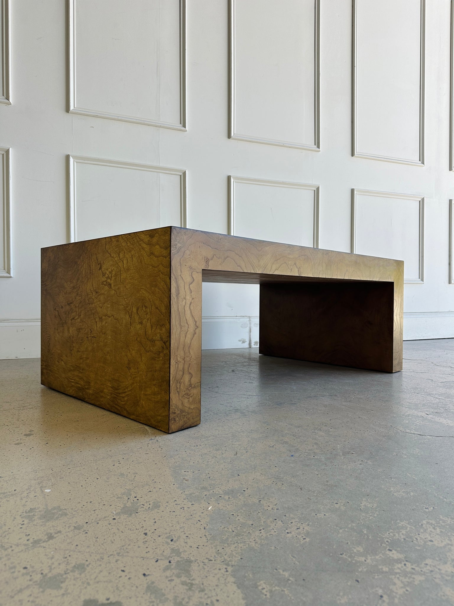 Elevate your living space with the sculptural elegance of our Burlwood Cocktail Table. Designed with a striking "staple" silhouette—featuring closed side panels and open front and back—this piece blends minimalist architecture with the warmth of natural woodgrain.