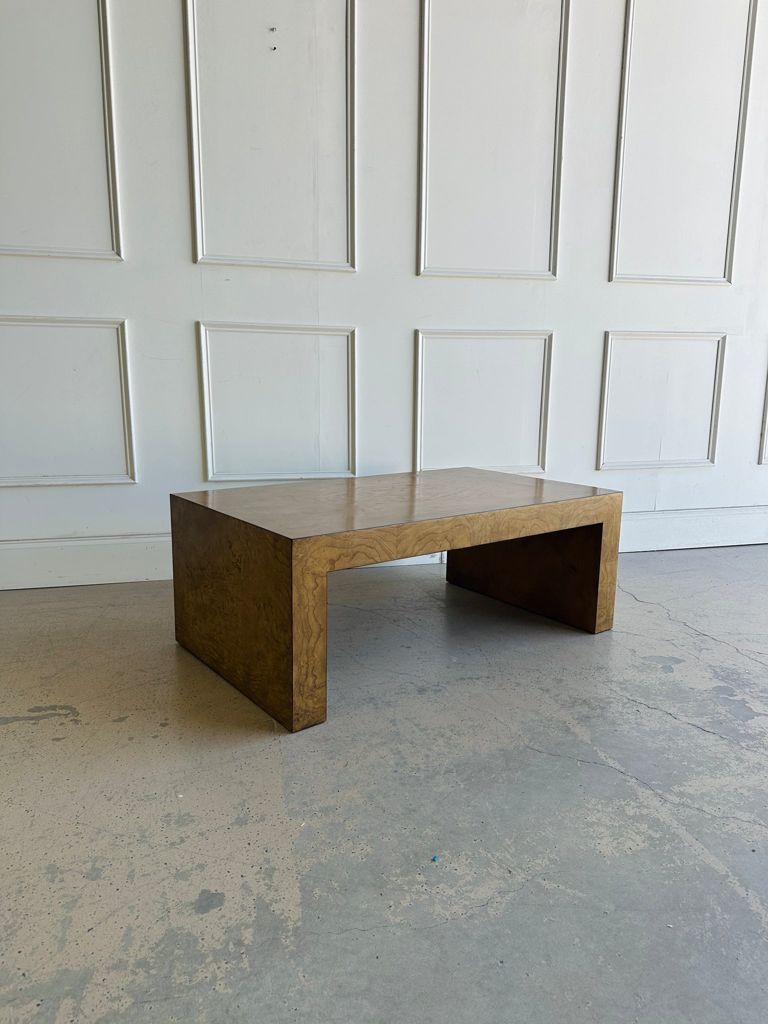 Crafted from solid wood and wrapped in a stunning book-matched burl veneer, every table is uniquely grained and rich with character. The clean lines and simple shape highlight the natural beauty of the burled ash finish, making it an ideal centerpiece for both modern and transitional interiors.