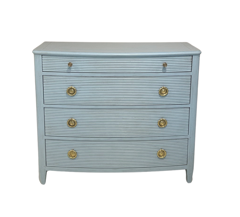 A compact chest designed to make an impact, the Camille Chest pairs classic proportions with a fresh, furniture-forward finish. Finished in French Blue, this piece brings a soft hit of color that still reads timeless, while subtle linear detailing across the drawer fronts adds texture and visual depth. Brass hardware introduces a warm contrast against the painted finish, giving the chest a tailored, finished look that works equally well in bedrooms, guest spaces, or as accent storage throughout the home. Built from hardwood solids and veneers, the Camille Chest balances durability with thoughtful design in a versatile, easy-to-place scale.