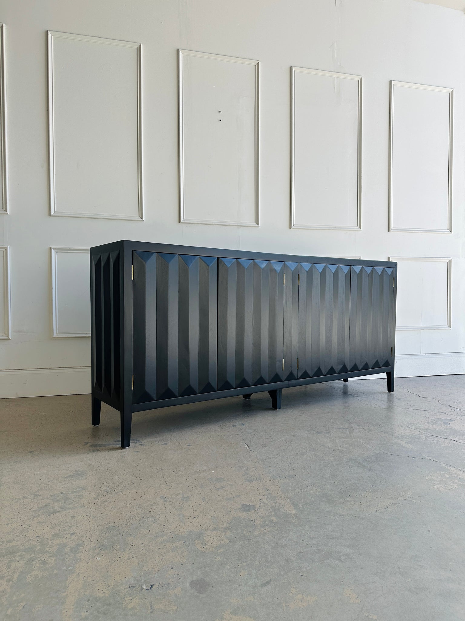 The Colorado Sideboard makes a dramatic statement with its clean lines and bold, faceted front design. Crafted from solid mahogany and finished in a variety of rich stain options, this piece offers a sleek, sculptural look that works beautifully in modern and transitional spaces alike. Its long, narrow profile is ideal for dining rooms, entryways, or living spaces that call for stylish storage without feeling bulky.