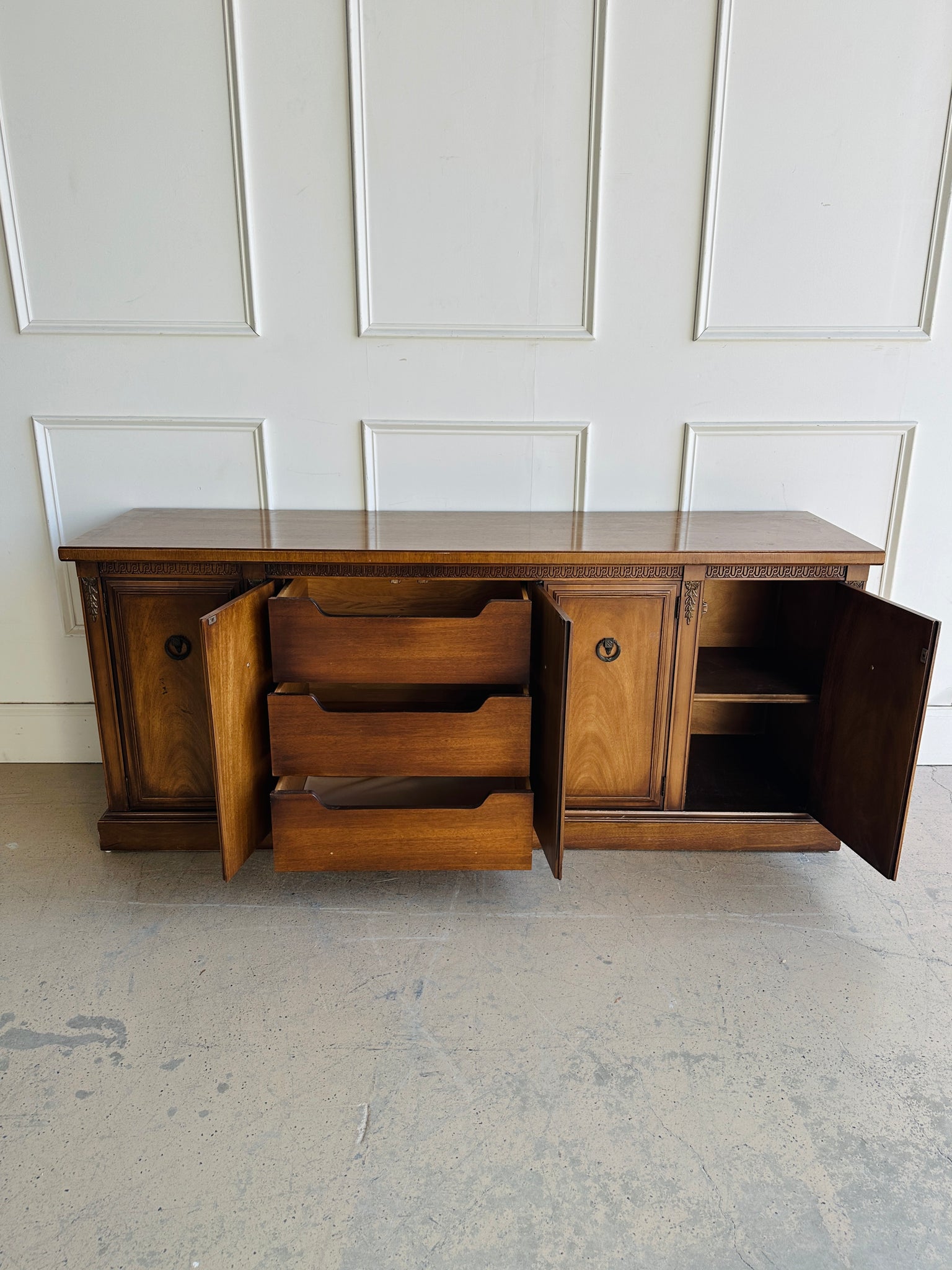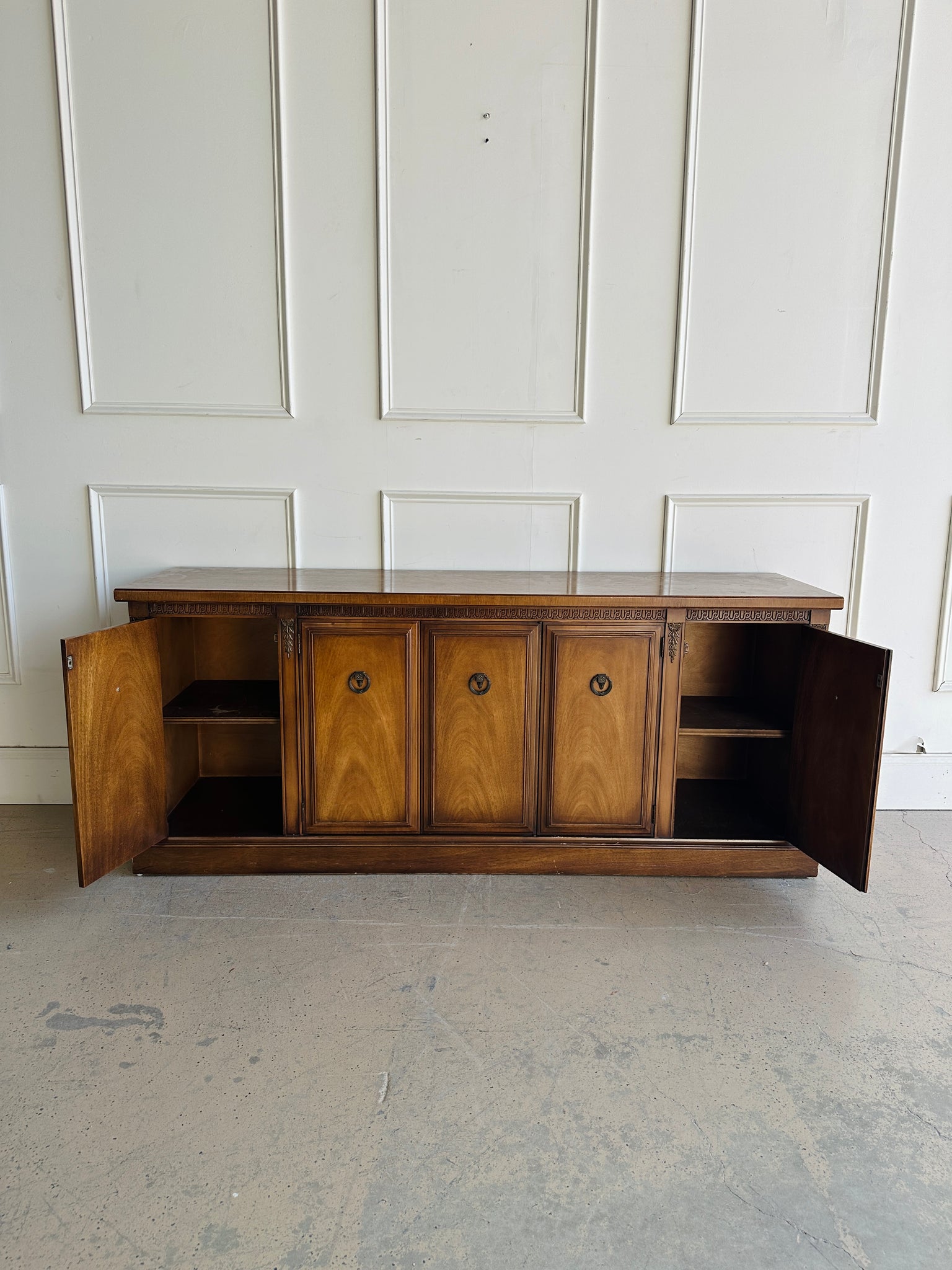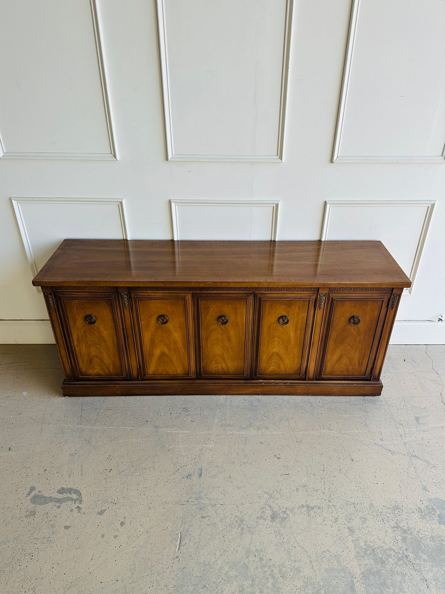 A beautifully built vintage Drexel credenza with classic Regency detailing—egg-and-dart frieze, framed doors, and elegant ring pulls. Behind the five paneled doors you’ll find two adjustable-shelf cabinets flanking a center bank of three interior drawers, giving you the perfect blend of hidden storage and organization. We’ll professionally lacquer the exterior in the color of your choice (Benjamin Moore, Farrow & Ball, Sherwin-Williams, etc.) and sheen (matte, satin, or gloss) to tailor it to your space—dining room buffet, living-room media console, or statement entry piece.