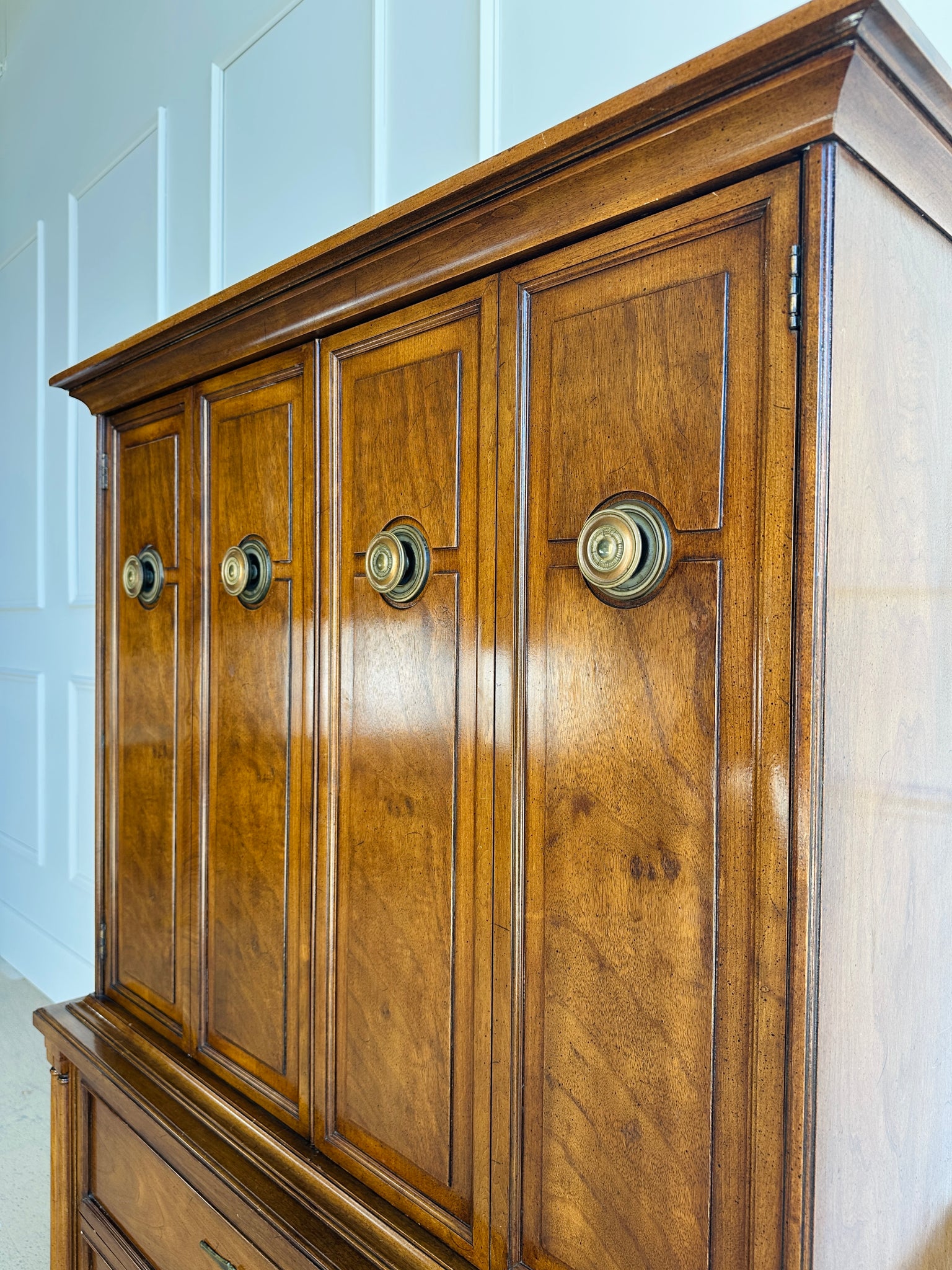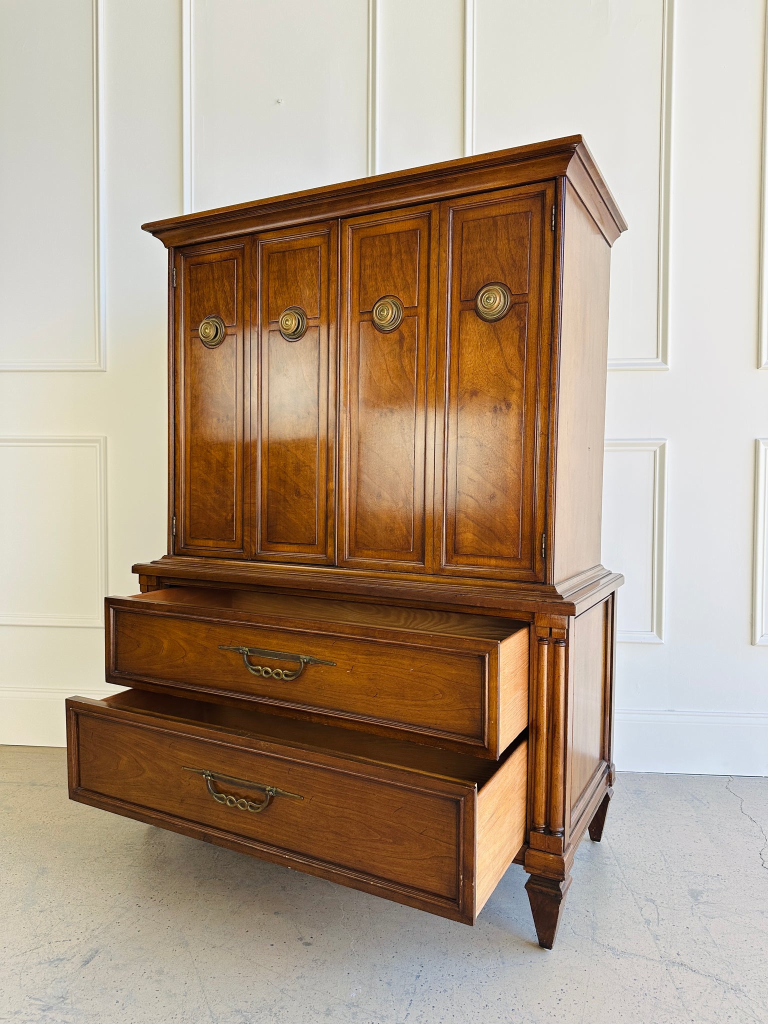 A handsome vintage armoire by Fancher Furniture, refreshed to your vision. We’ll professionally refinish this piece in a premium lacquer of your choice, preserving its classic lines, paneled doors, and original brass hardware. The result is a timeless storage piece—equally at home in a bedroom, entry, or living space—that blends heirloom construction with a clean, modern finish.