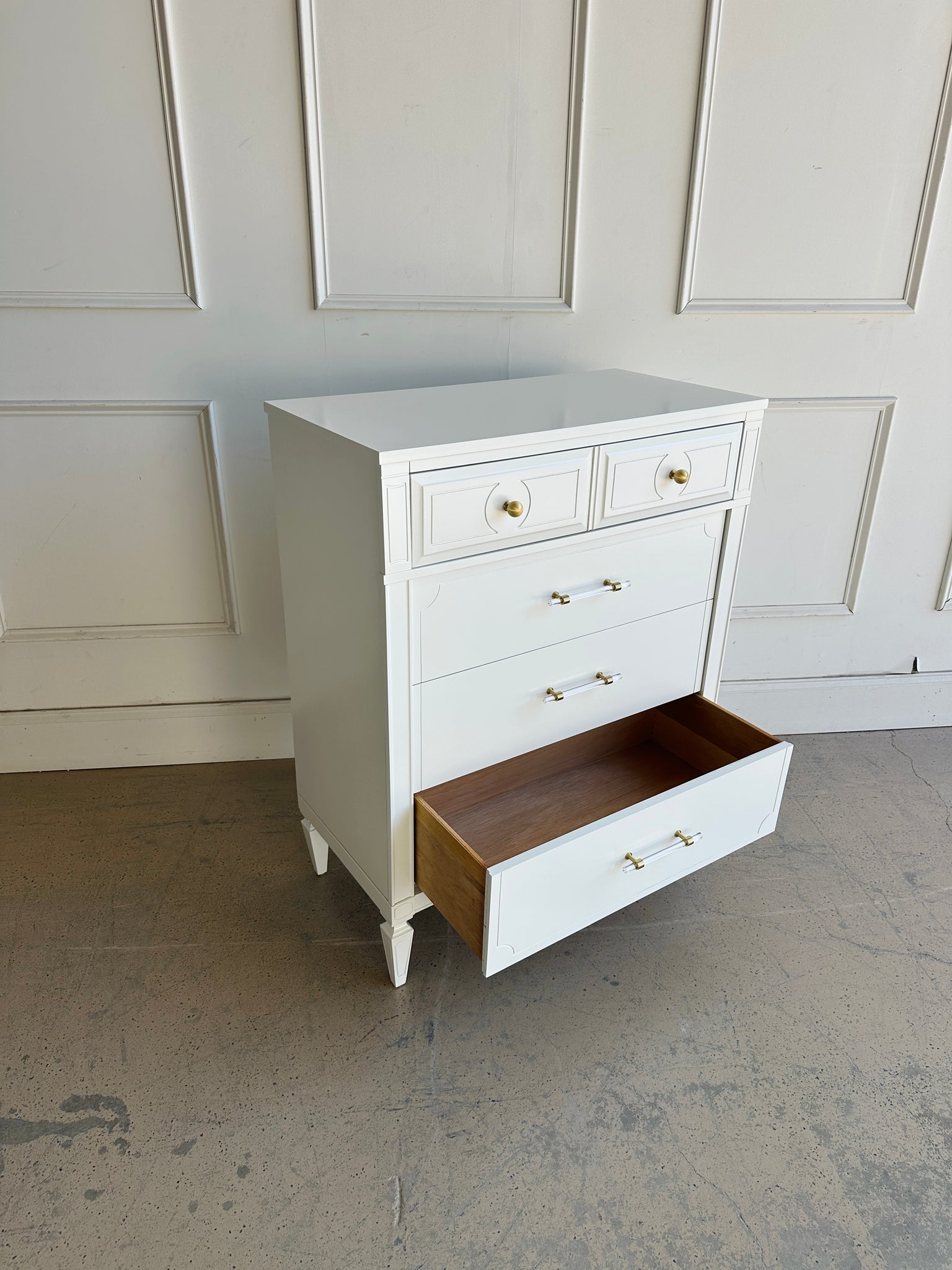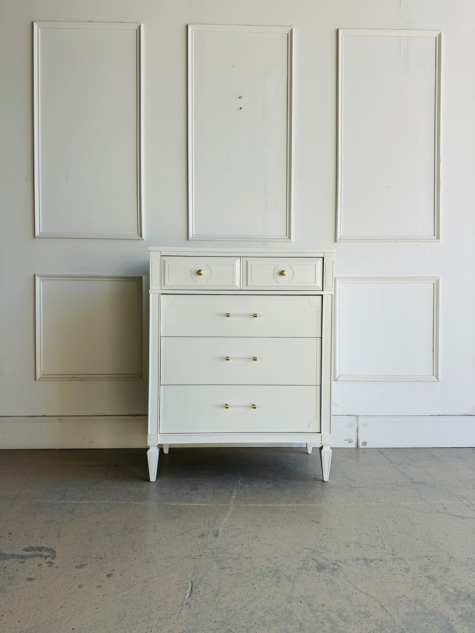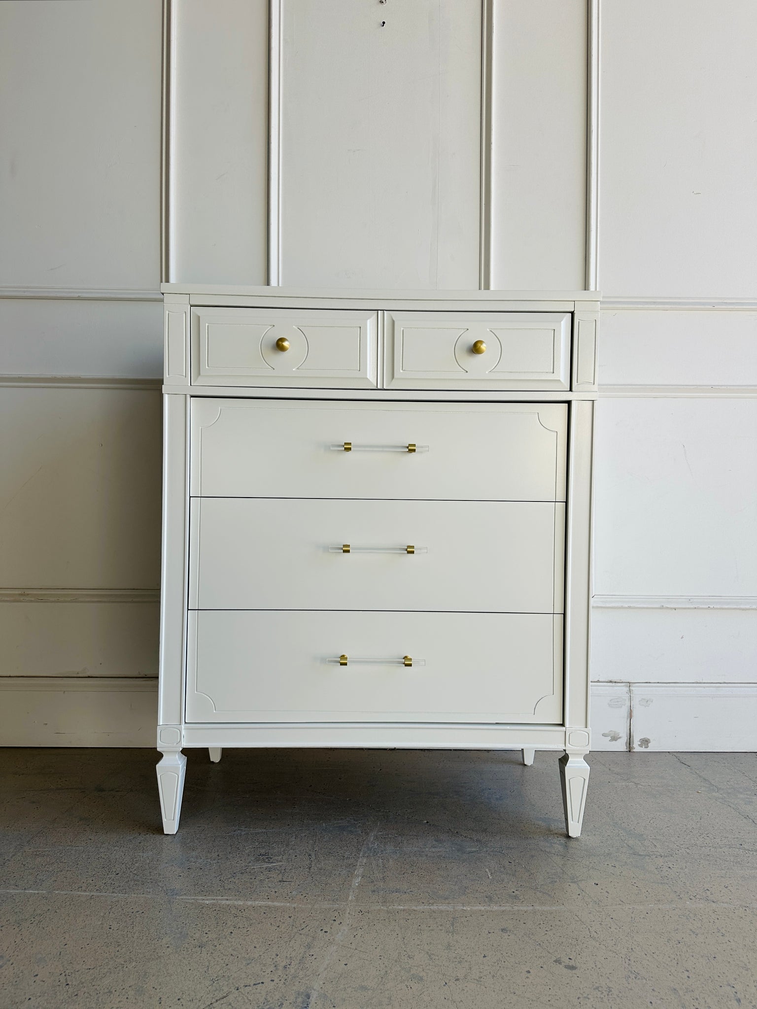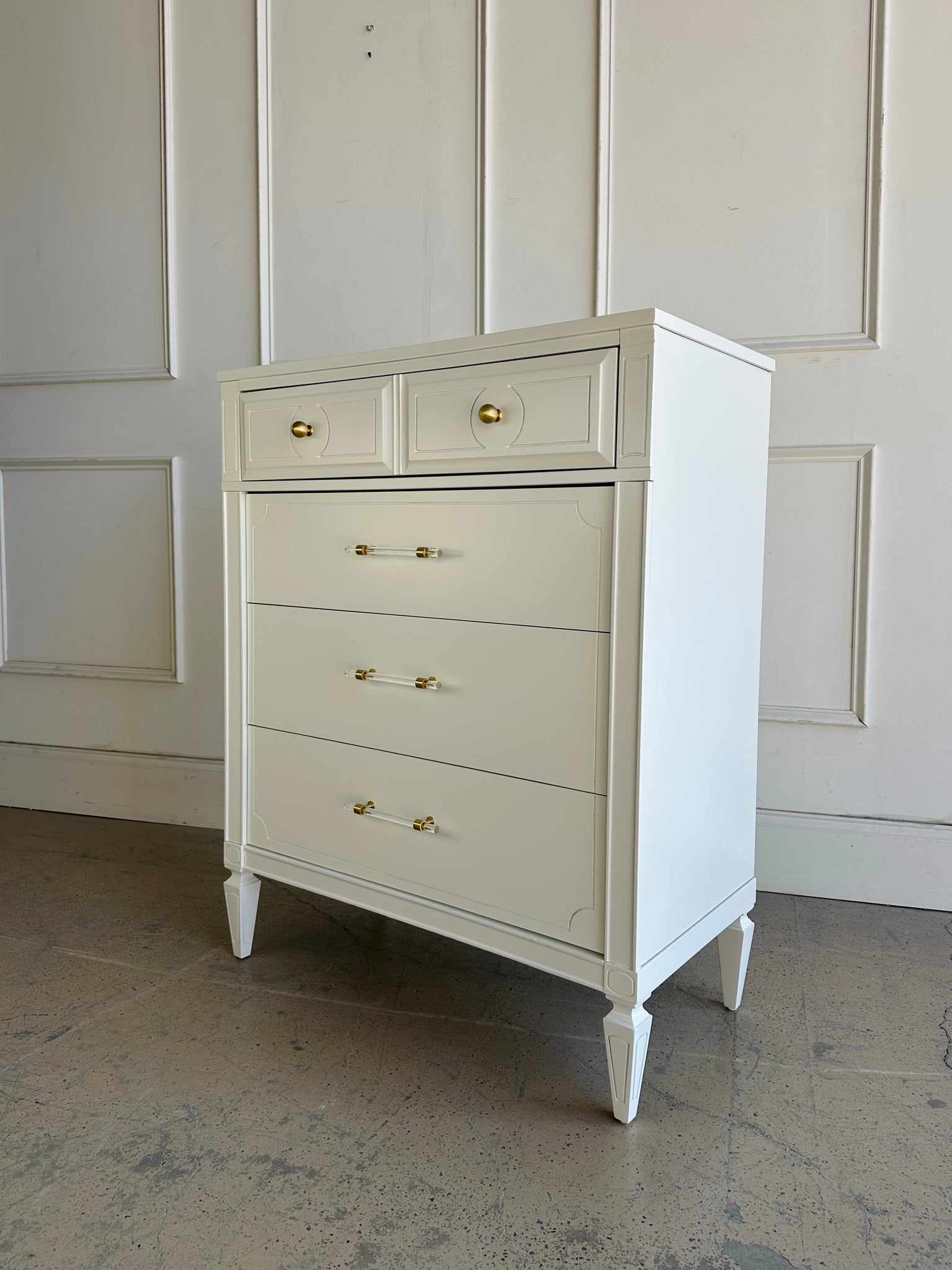 Beautiful design on this Five Drawer Vintage Chest with a new professionally sprayed lacquer finish which is done in "White Dove" by Benjamin Moore. Drawers are all dovetailed and glide smoothly. In addition to the new durable lacquer finish, we also installed new brass and lucite hardware for an elevated new look.
