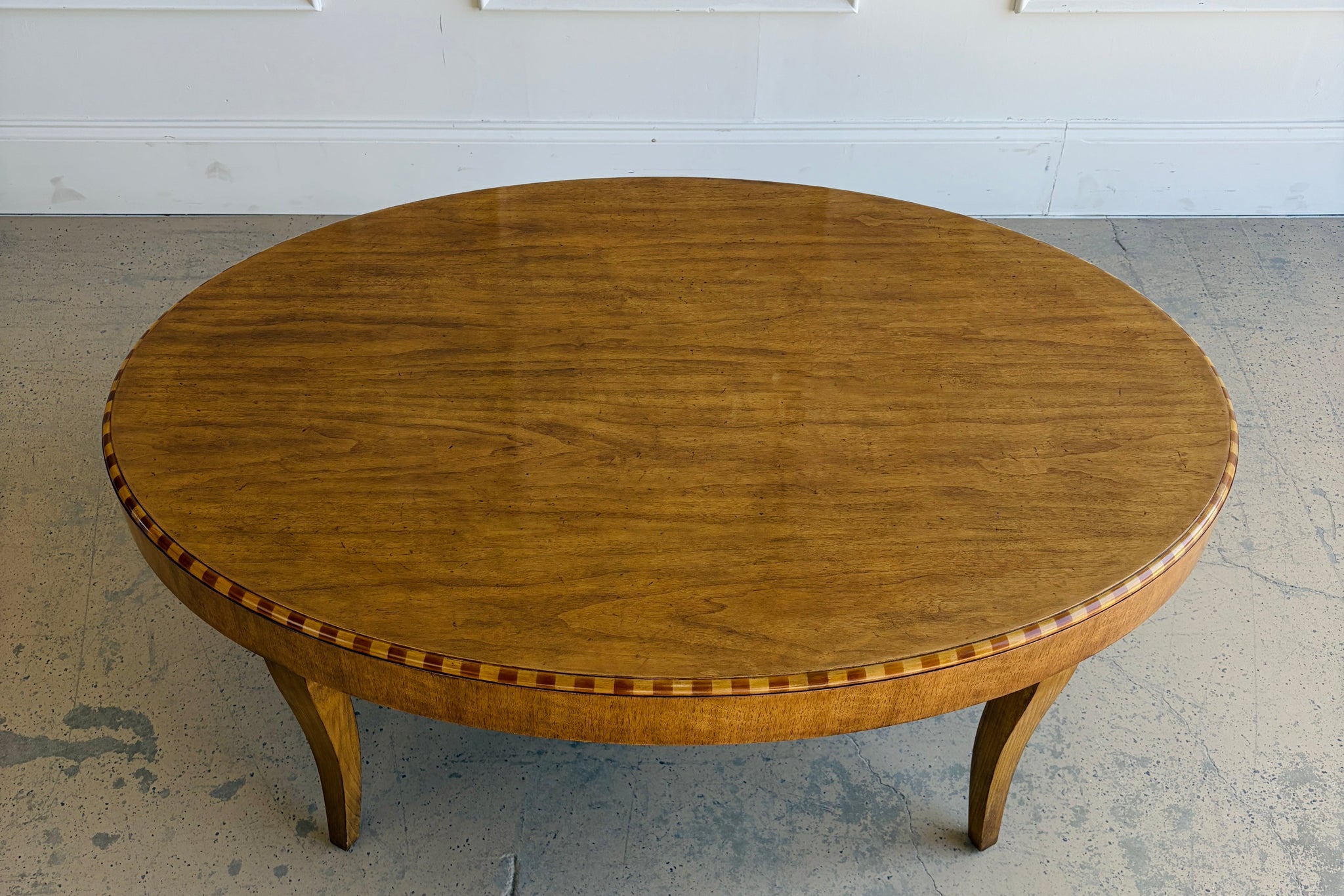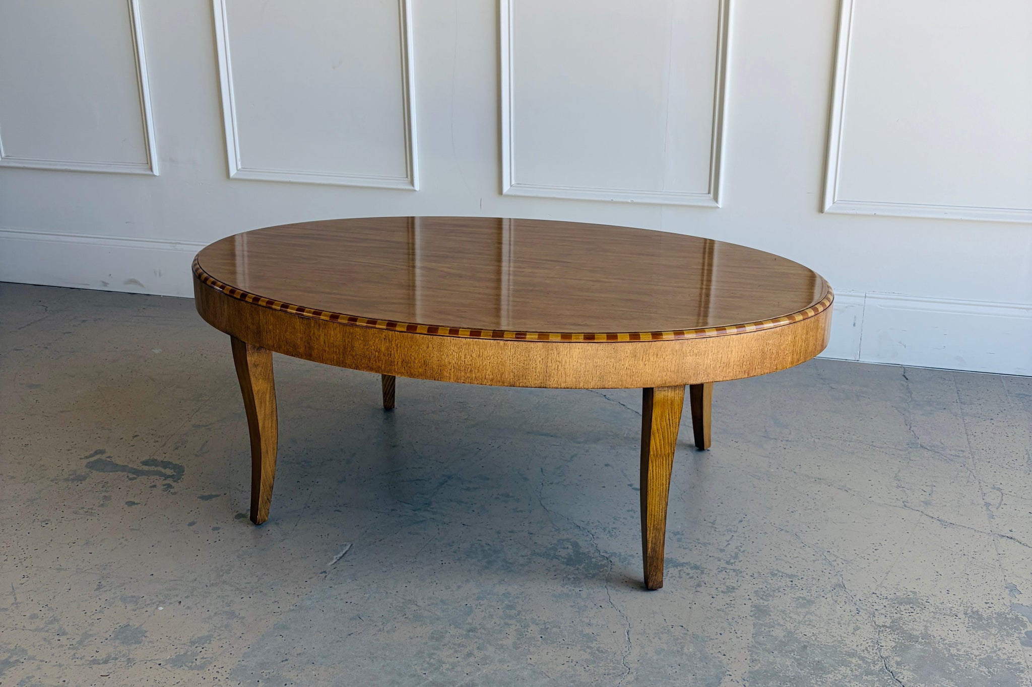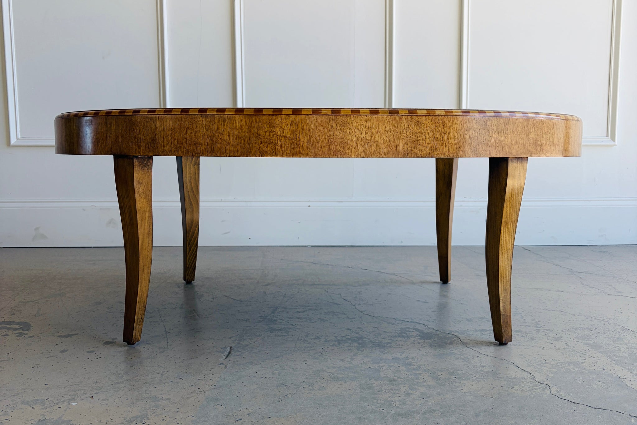 The Lillian August Coffee Table is a refined, transitional piece defined by its graceful oval silhouette and rich wood detailing. The warm finish highlights the natural grain of the wood, while subtle inlay banding along the top edge adds depth and quiet sophistication.