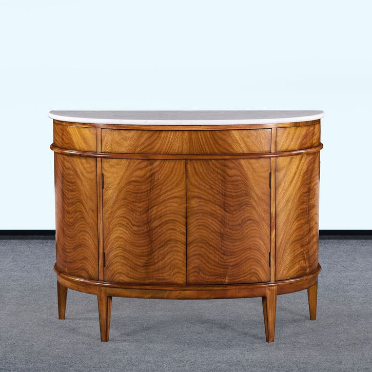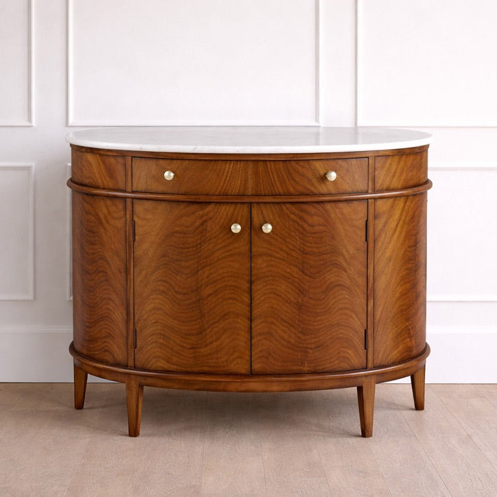 The Lipton Demilune Cabinet is a refined storage piece with a softly curved, architectural silhouette. Crafted from mahogany solids with cerejeira veneers, it showcases a flowing, bookmatched grain pattern across the rounded front for a warm, elevated look. The demilune shape is especially useful in tighter spaces—entryways, dining rooms, and living rooms—where you want presence without bulk. Available with either a marble top for a dressed-up finish or a mahogany top for a cohesive, all-wood look.