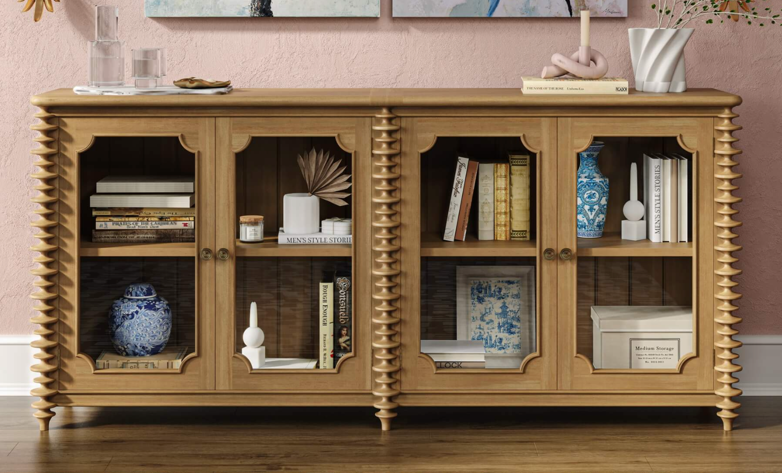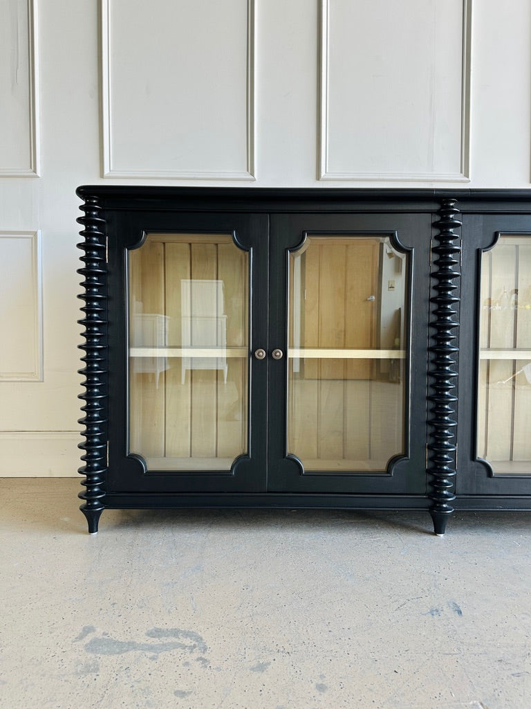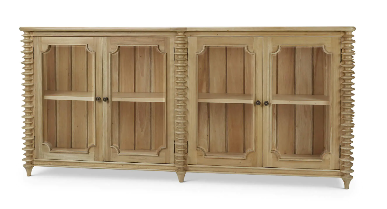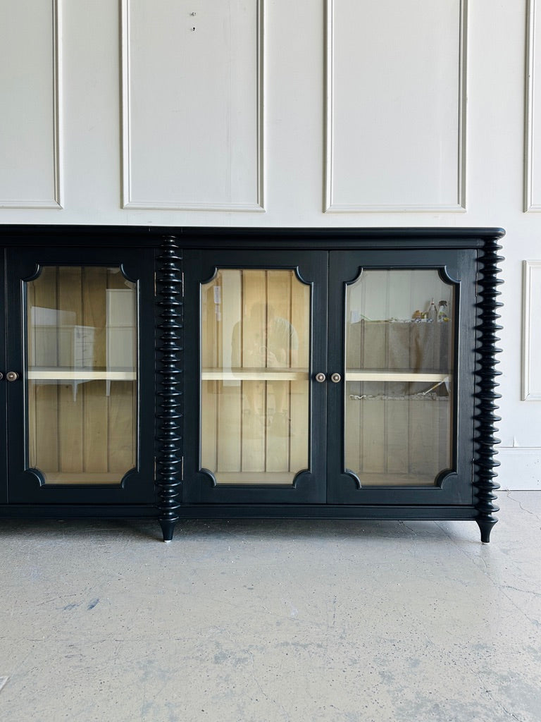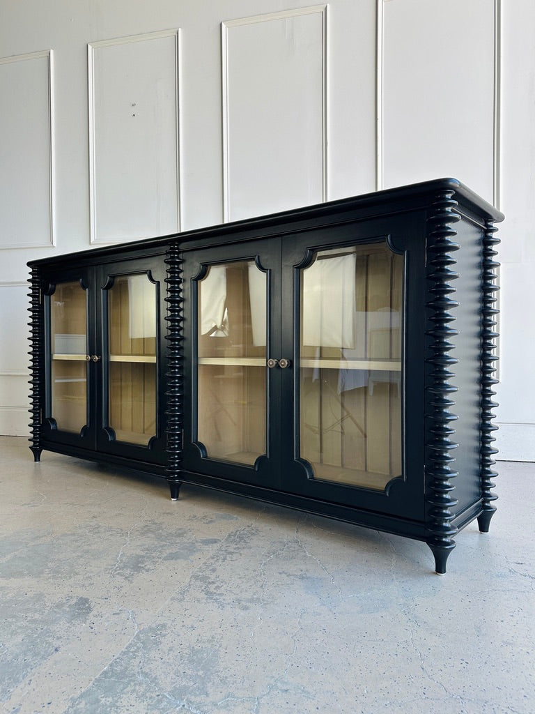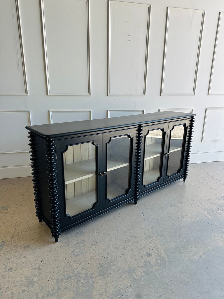 The Milano Sideboard blends traditional craftsmanship with eye-catching detail, making it the perfect statement piece for dining rooms, living spaces, or entryways. Handcrafted from solid mahogany, it features elegant stacked turning details and four framed glass-panel cabinet doors that reveal adjustable interior shelving—perfect for storing or displaying serveware, collectibles, or books.