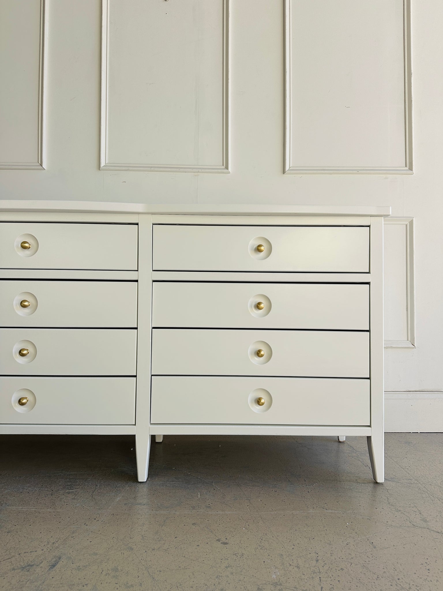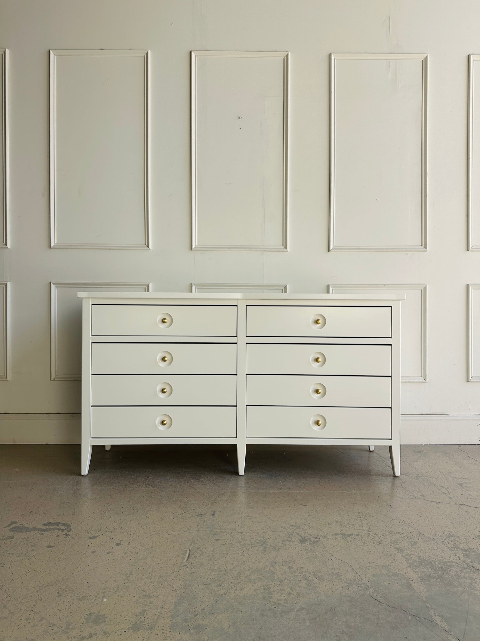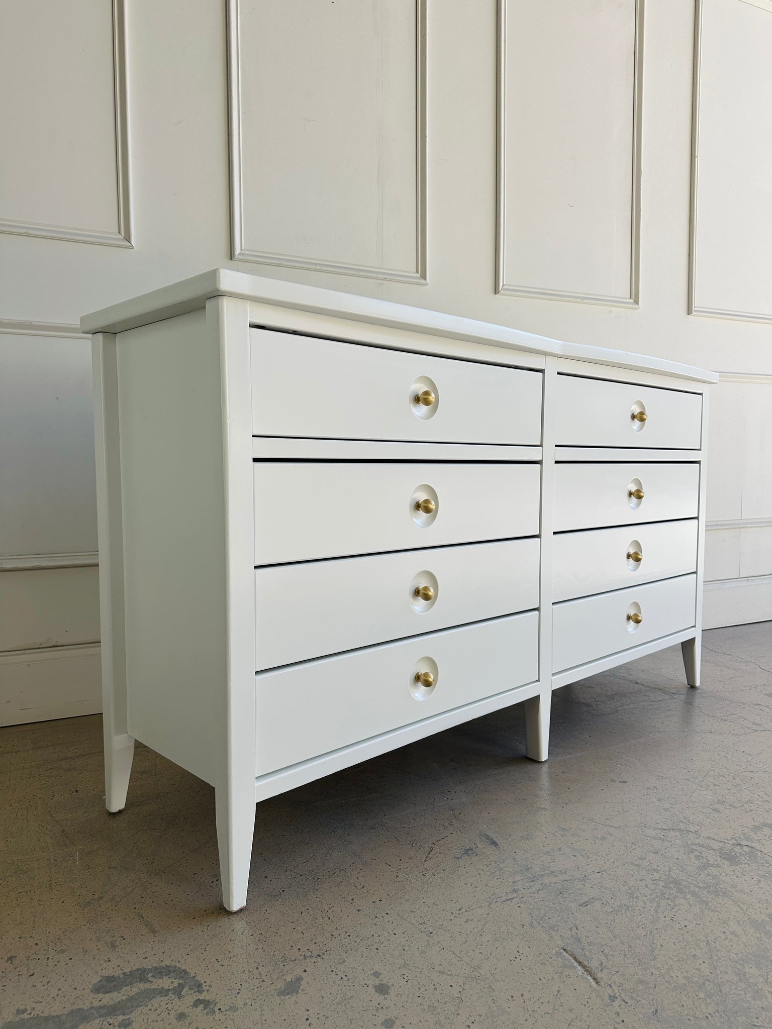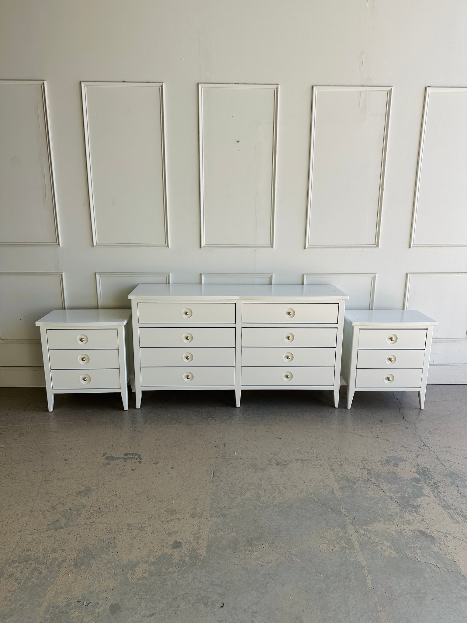 This "Set" includes an 8-drawer dresser, refinished to perfection in White Dove by Benjamin Moore lacquer for a crisp, modern update as well as "TWO" matching Nightstands. This set balances timeless craftsmanship with sleek, contemporary styling, making it a versatile addition to any home. With its long, clean silhouette and elegant presence, it’s a dresser that feels as sophisticated as it is practical.