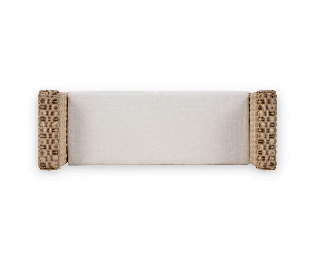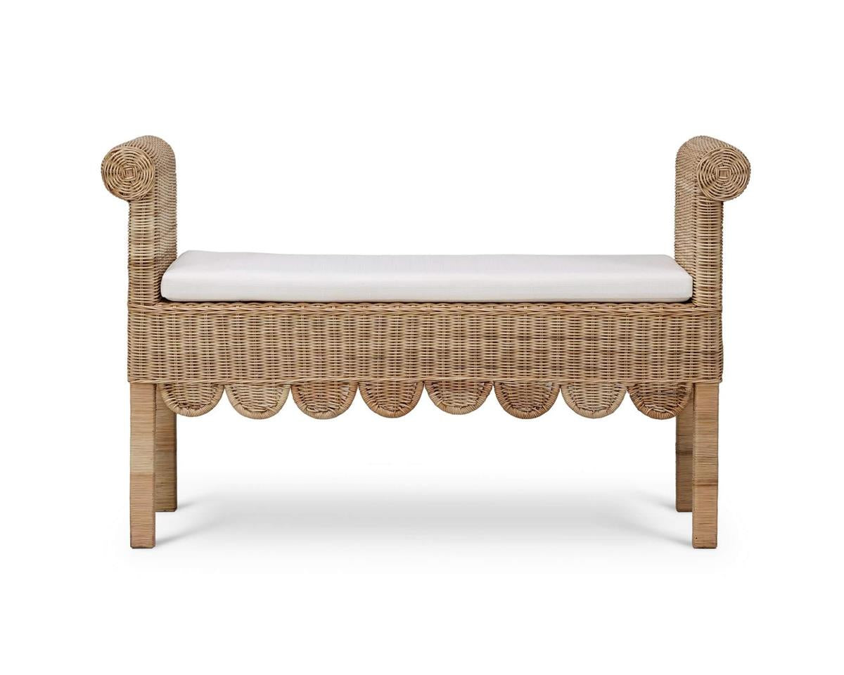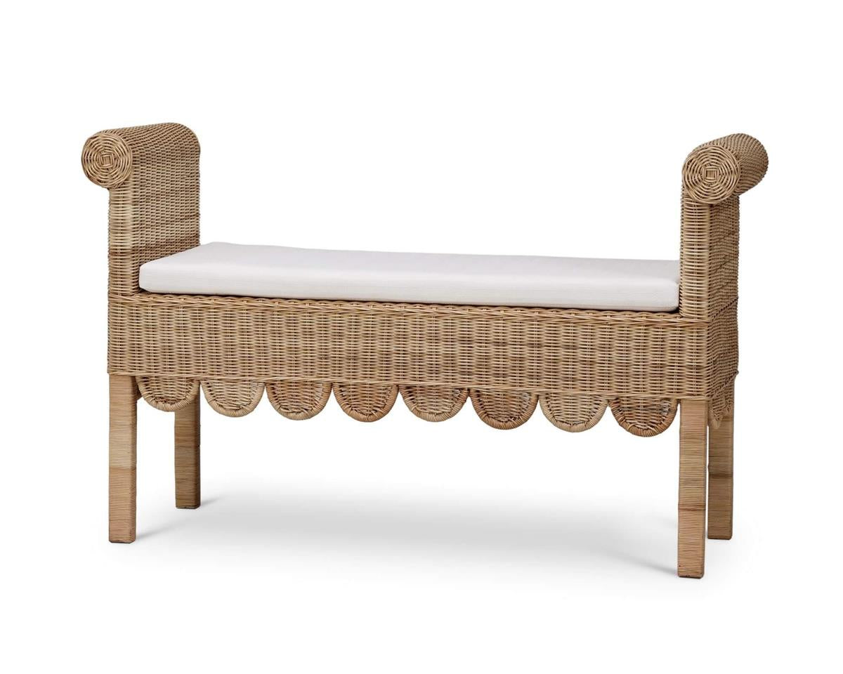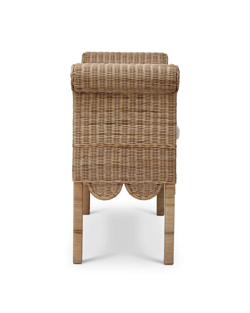 The Newport Scalloped Bench brings relaxed elegance and refined craftsmanship together in one beautifully detailed piece. Handwoven in natural rattan, the bench features a sculptural silhouette defined by rolled arms, turned legs, and a distinctive scalloped apron that adds visual texture and charm. The airy woven construction keeps the look light while still feeling substantial and grounded.