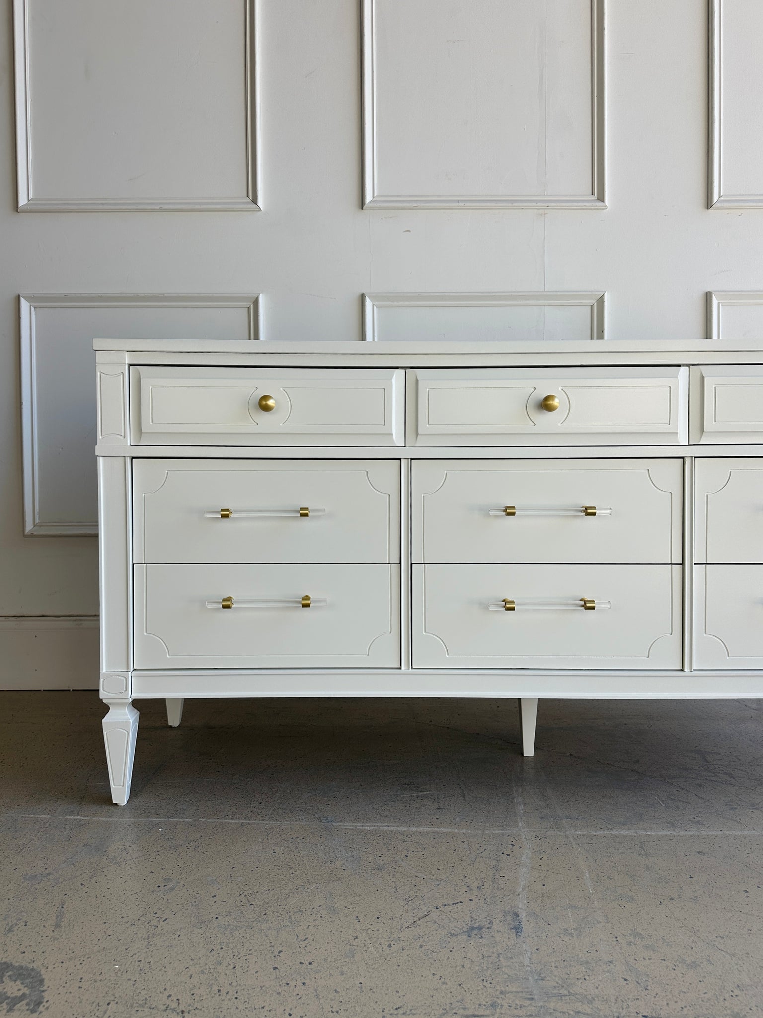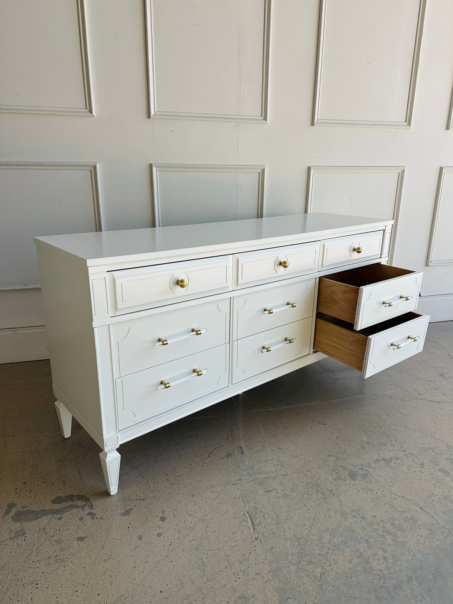 Beautiful design on this Nine Drawer Vintage Dresser with a new professionally sprayed lacquer finish which is done in "White Dove" by Benjamin Moore. Drawers are all dovetailed and glide smoothly. In addition to the new durable lacquer finish, we also installed new brass and lucite hardware for an elevated new look.