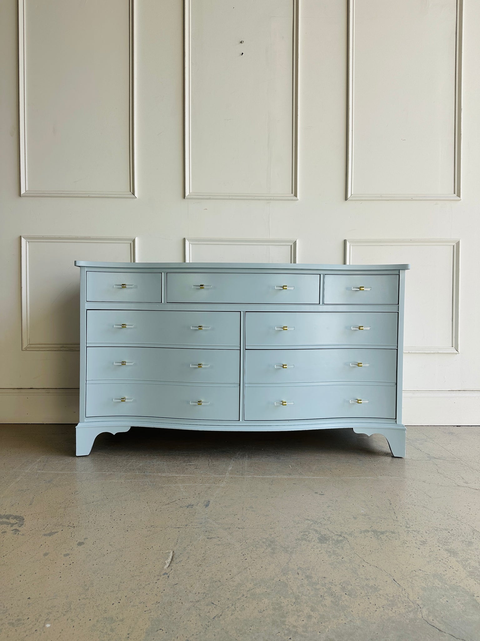 The dresser is accented with updated lucite and gold hardware, adding a touch of glam and sophistication. With its graceful serpentine front and nine spacious drawers, it provides both beauty and functionality—perfect for use in a bedroom, entryway, or living space.