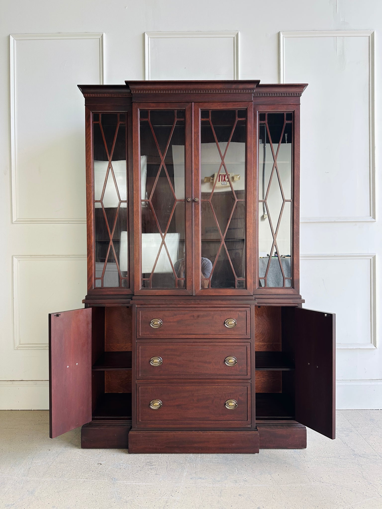 A classic statement of American cabinetmaking, this vintage China cabinet by Rway Furniture Co. features rich mahogany tones, crisp dentil molding, and elegant diamond-mullion glass doors. The upper hutch provides generous, light-reflecting display space for china, glassware, or books, while the lower credenza base offers concealed storage to keep dining or living spaces polished and organized. Original brass oval pulls add a refined note and the slim 16" depth makes it easy to place in dining rooms, living rooms, or libraries without overwhelming the room.