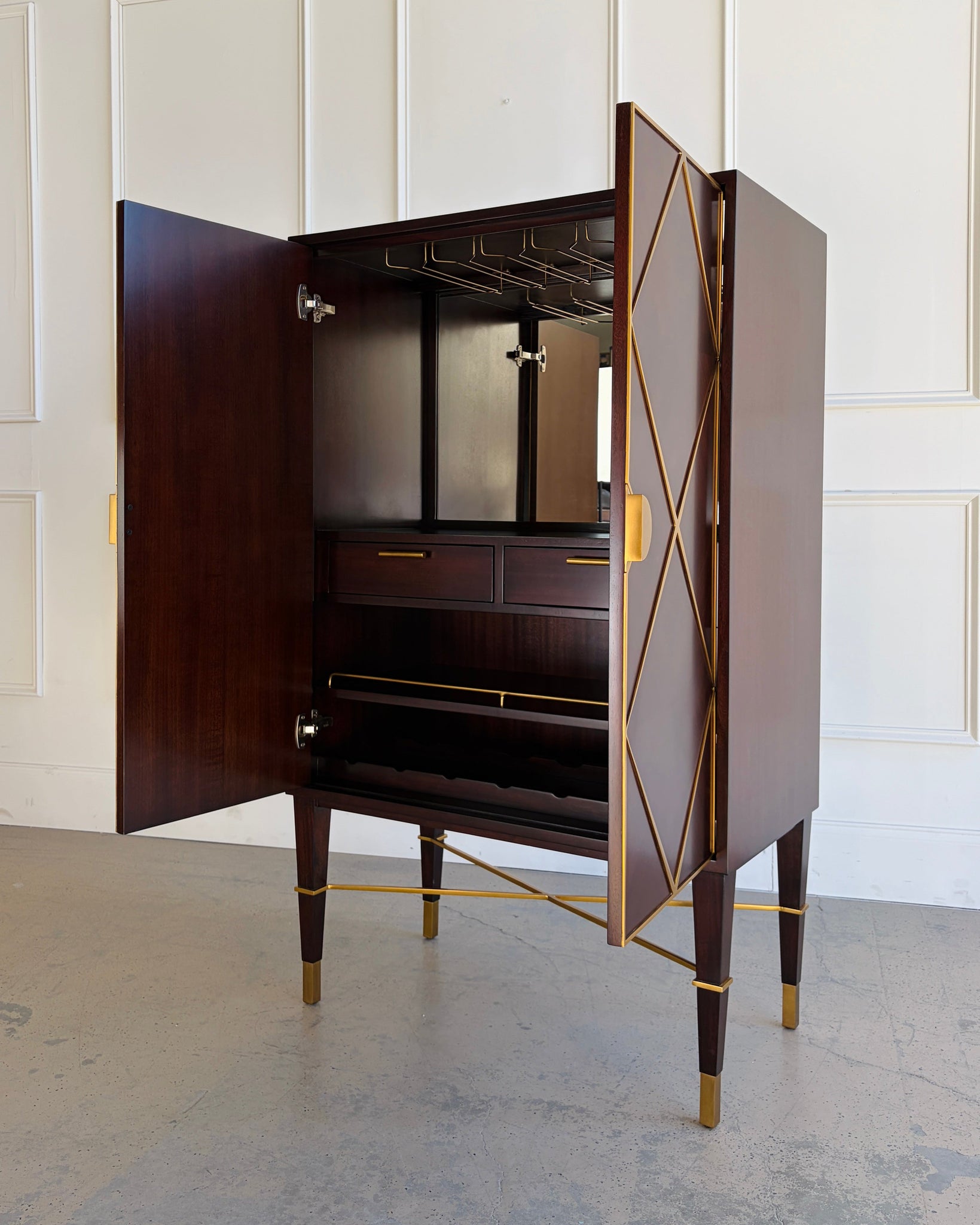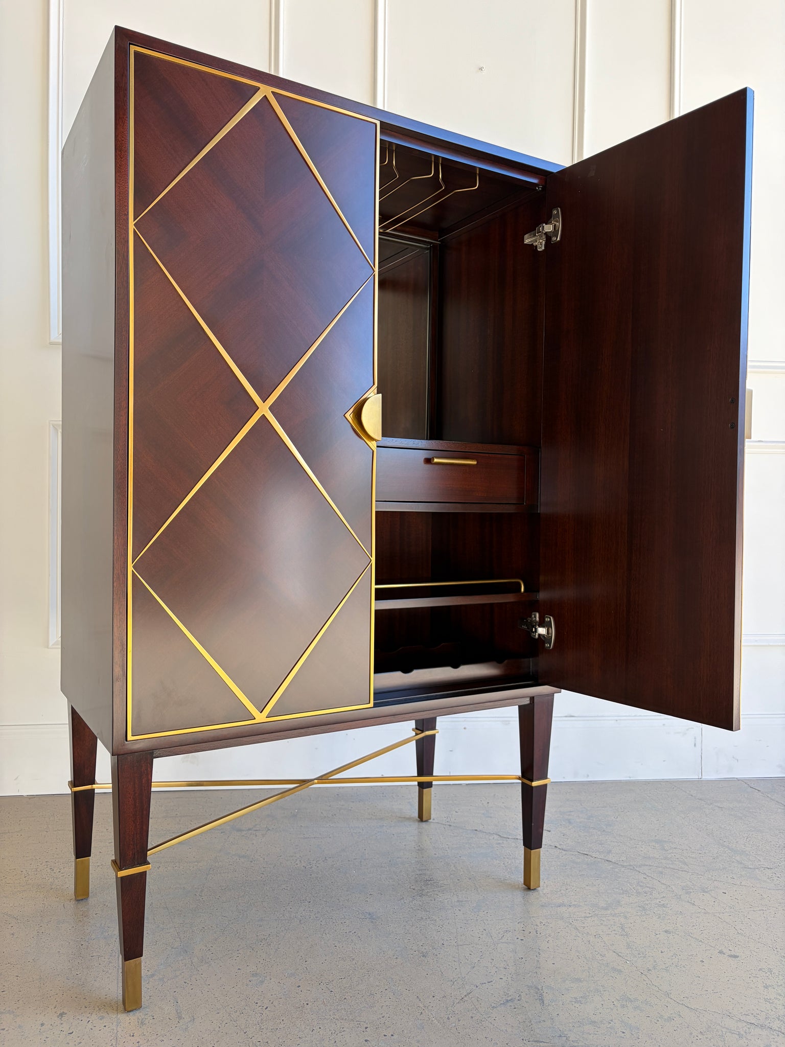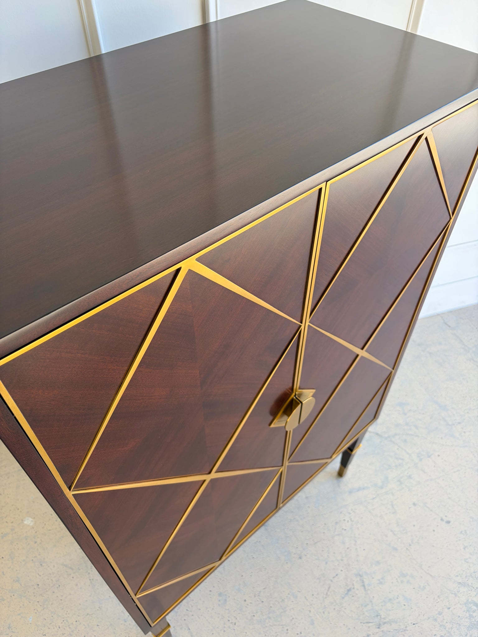 - Mahogany parquet door fronts with geometric brass diamond trim