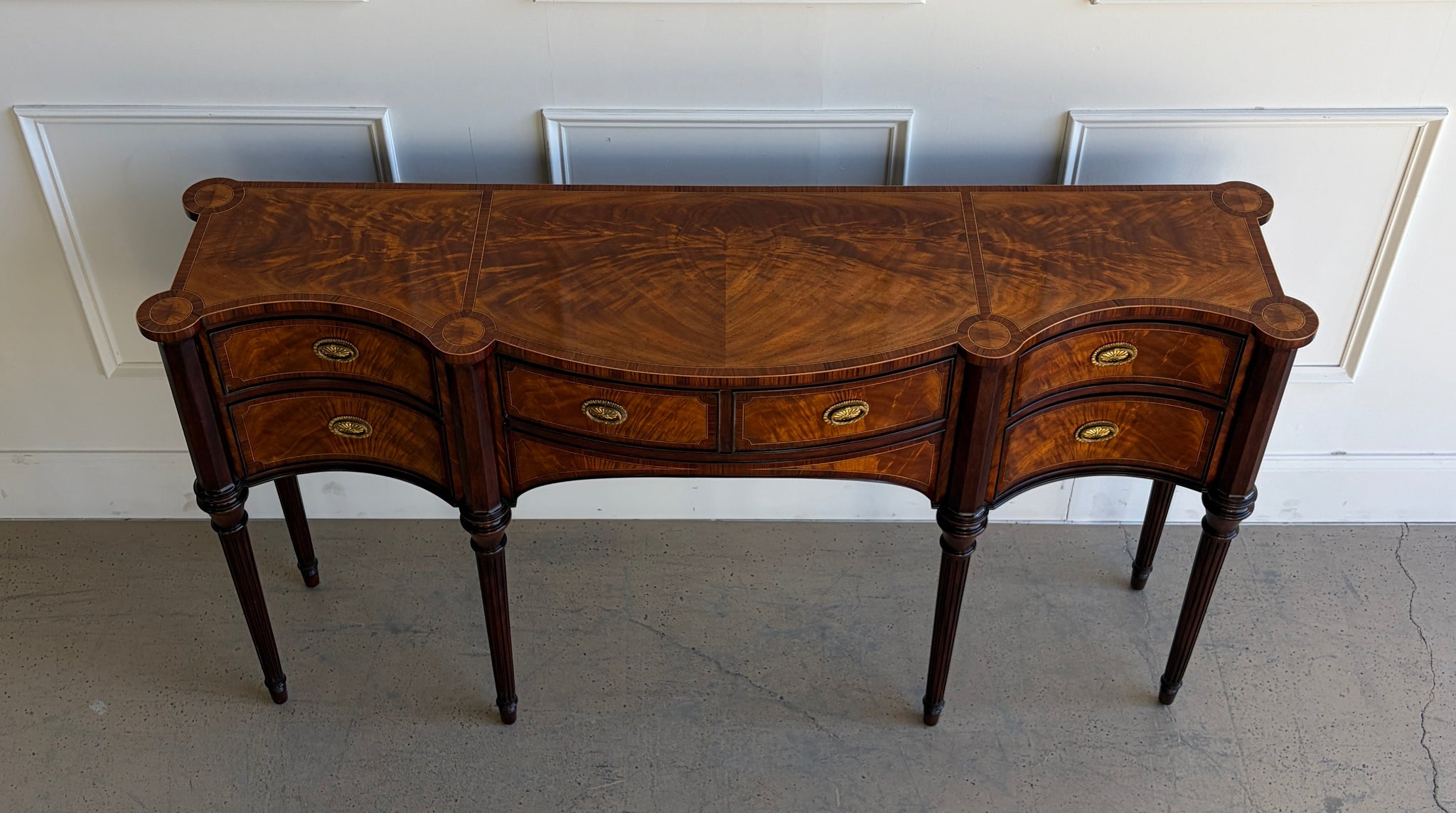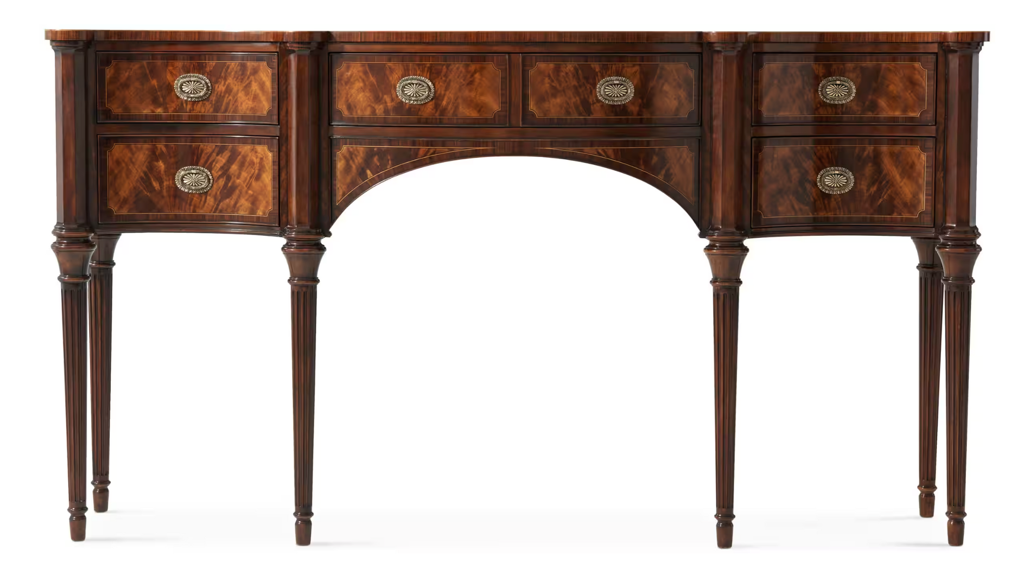 Handcrafted from mahogany with richly figured flame veneers, the Stanhope Row Sideboard showcases exceptional detailing throughout. A morado crossbanded top with subtly protruding corners rests above turned uprights and tapering fluted legs, creating a sense of rhythm and balance. The façade features a central double-fronted frieze drawer above an arched apron, flanked by two concave-front drawers that echo the fluid curvature of the case. Every element reflects Theodore Alexander’s commitment to period-inspired design and heirloom-level construction.