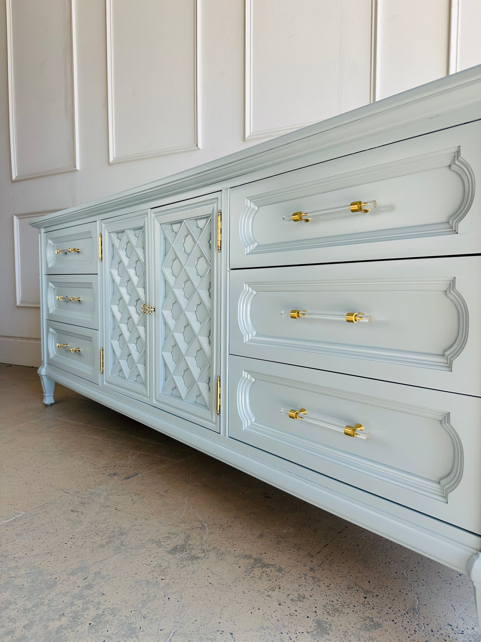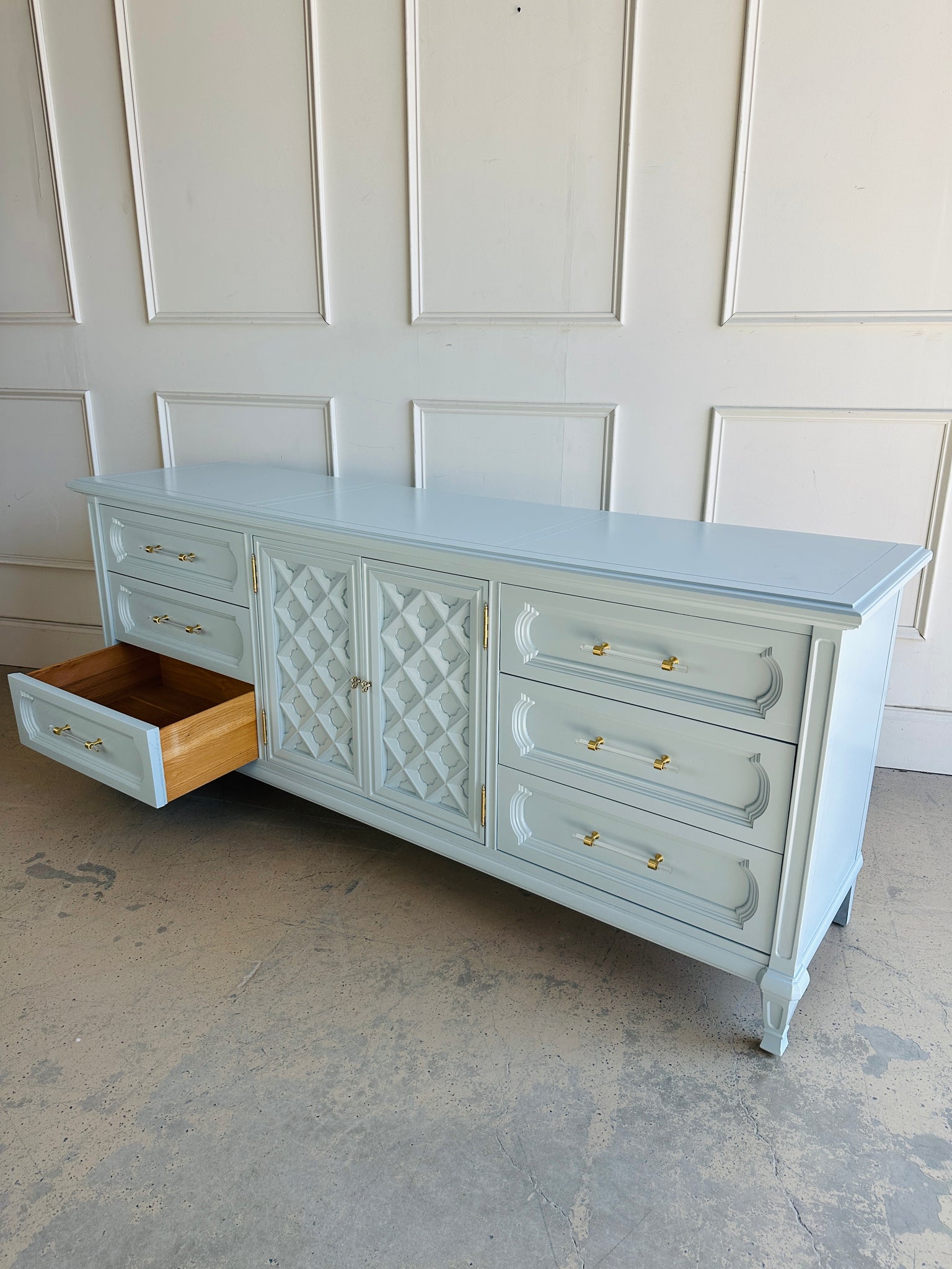 Nine storage areas: six full-size drawers plus a center cabinet with interior storage