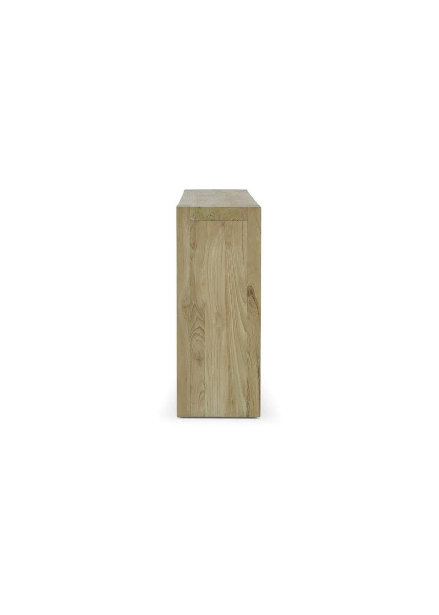 The design is intentionally minimal: a thick rectangular top supported by solid block legs creates a strong horizontal presence without feeling heavy. With its narrow depth, this console works beautifully in entryways, hallways, or behind a sofa, offering visual impact without overwhelming the space. The warm, weathered teak finish pairs effortlessly with both modern interiors and more traditional, European-inspired settings.