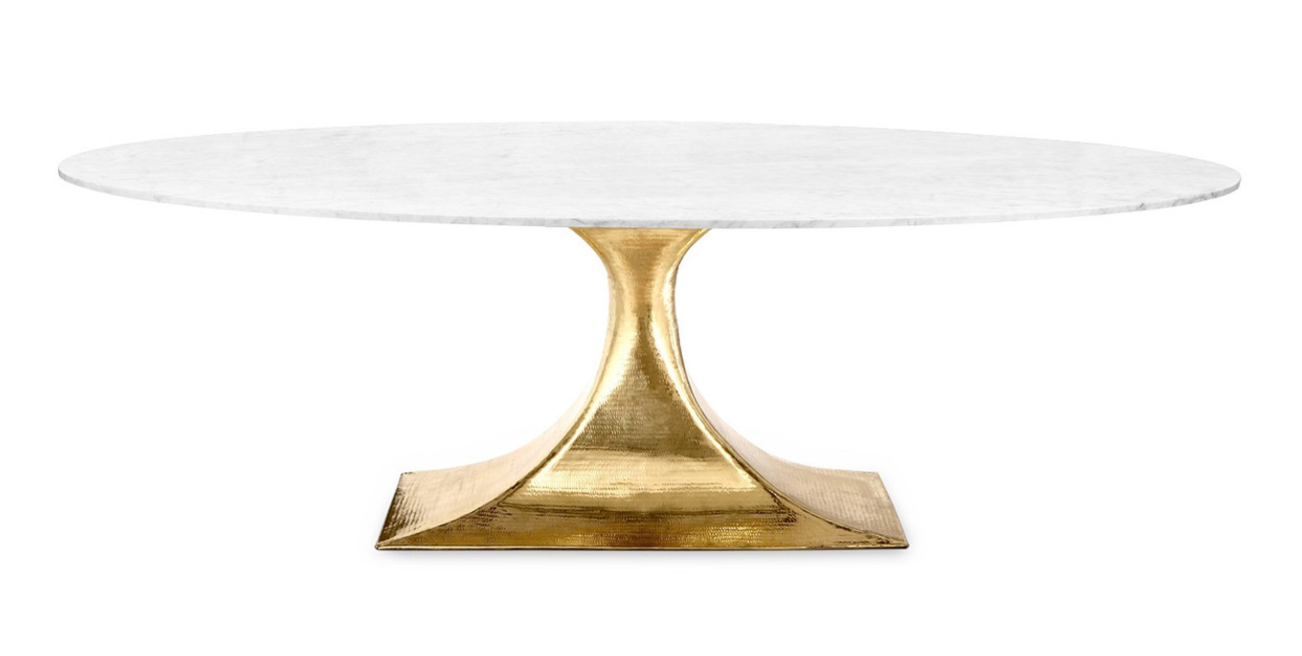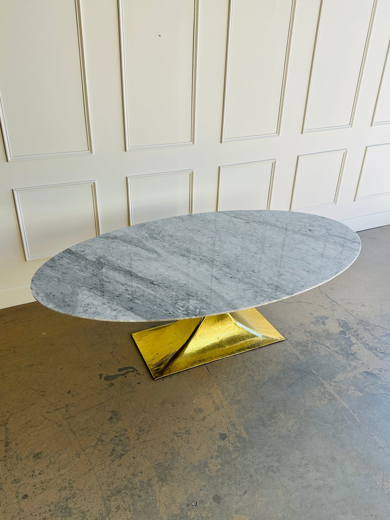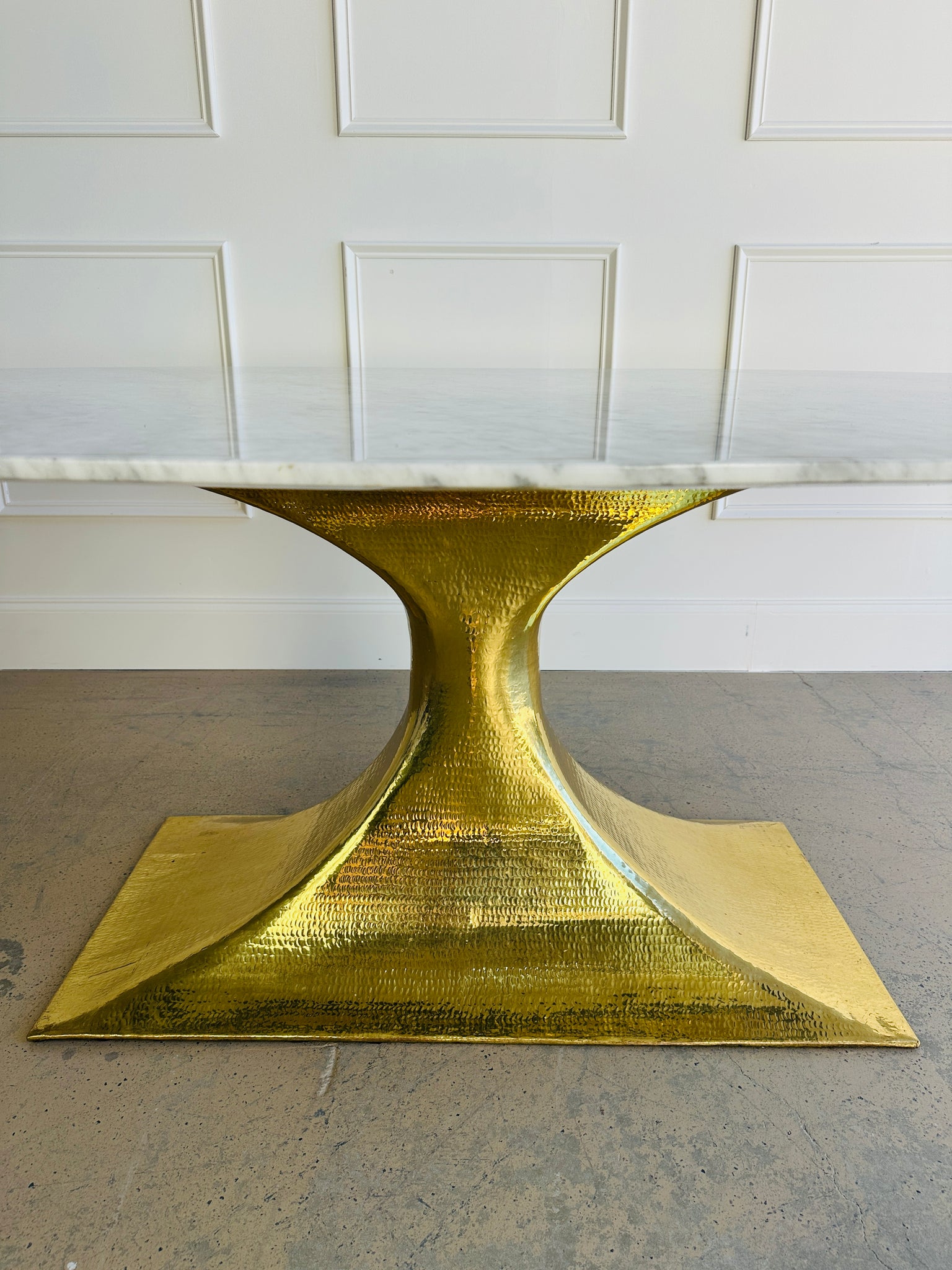 Sculptural and statement-making, this gently used Stockholm pairs a luminous, hand-hammered repoussé brass pedestal with a sleek white Carrara marble oval top. The flared silhouette reads like art from every angle—catching light across hundreds of artisanal hammer marks—while the expansive marble surface anchors a room with quiet luxury. It’s the table you design the space around.