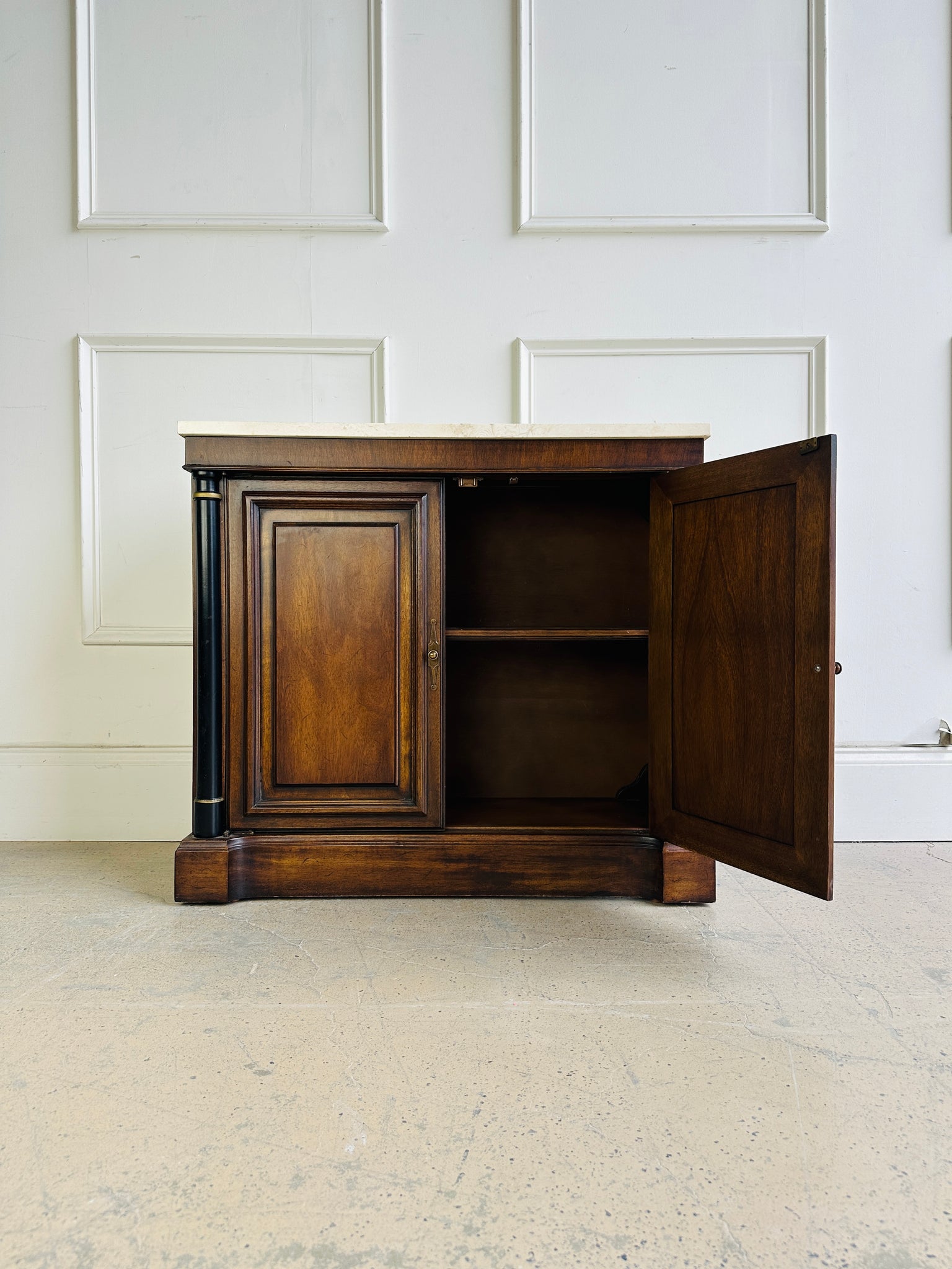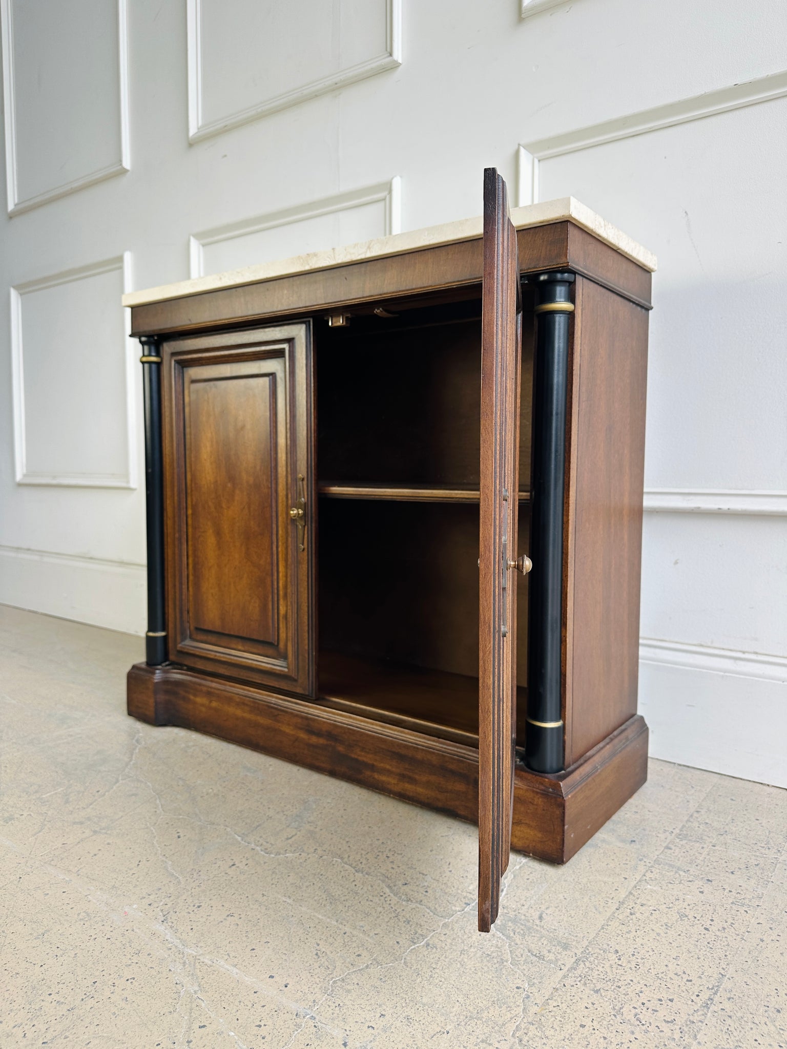 FREE SHIPPING! This elegant vintage cabinet is a true statement piece - featuring a beautifully veined travertine top, rich walnut tones, and black column accents with brass detailing. Perfect as an entryway console, bar cabinet, or sophisticated storage in any room.
