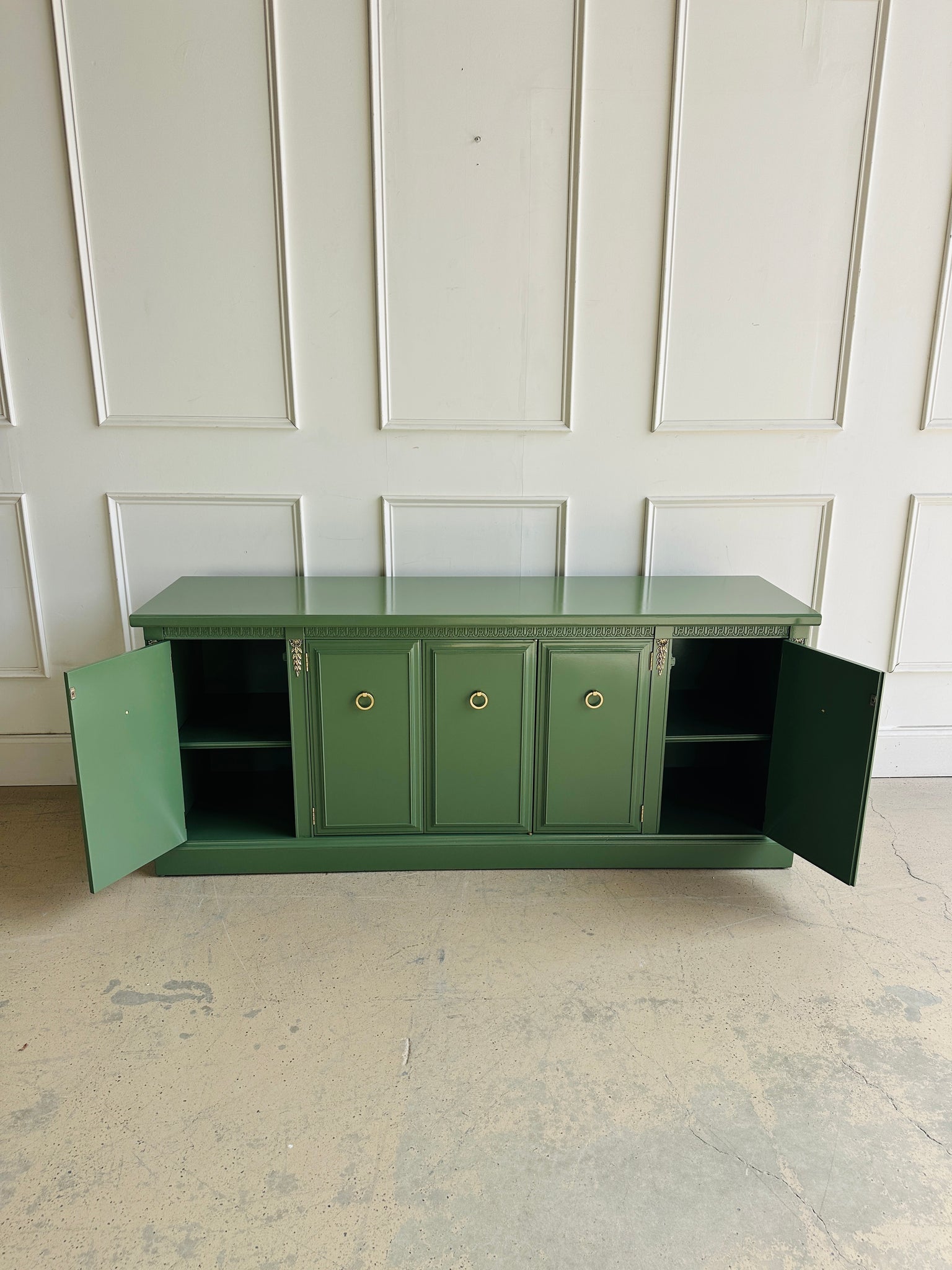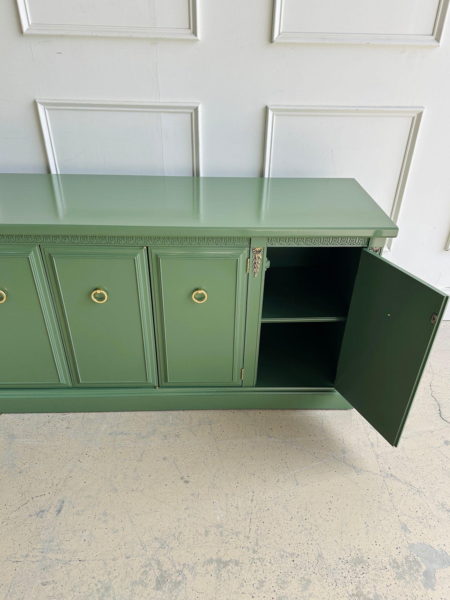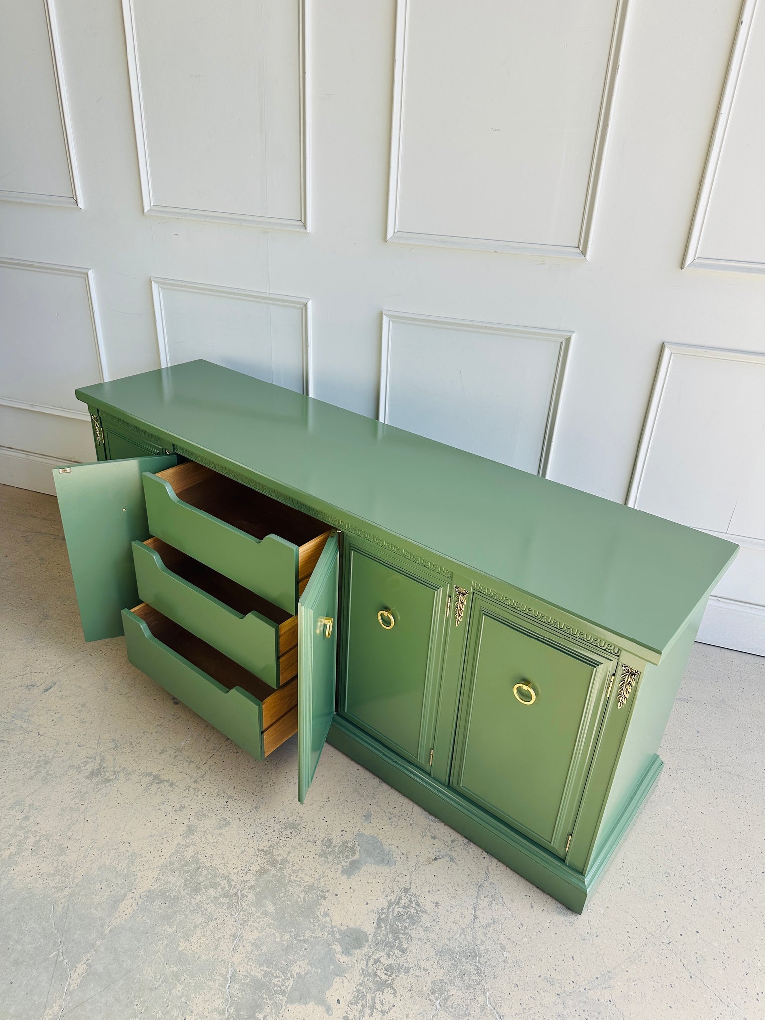 This striking vintage credenza by Drexel Furniture has been professionally lacquered in a custom mix of Benjamin Moore Herb Garden and Sweet Basil, creating a bold yet versatile green that makes an unforgettable design statement. With its clean lines, intricate carved detailing, and elegant proportions, this piece embodies both sophistication and functionality.