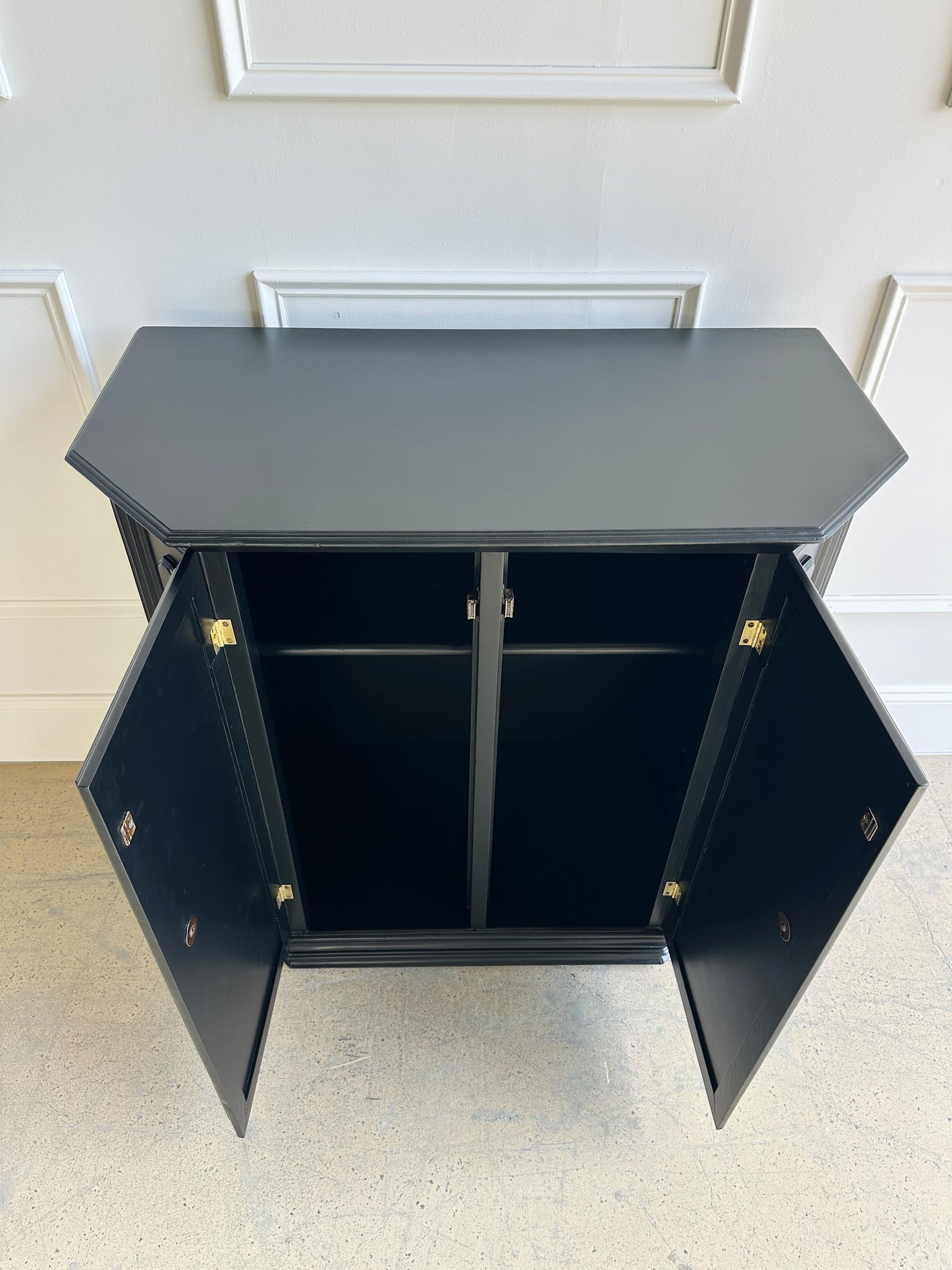 A bold, space-savvy storage piece for the entry, living room, or dining nook. This vintage hall cabinet has been professionally lacquered in a rich satin Black that sharpens its architectural silhouette and highlights the stepped, faceted case. Behind the twin doors you’ll find a full-width shelf—perfect for tucking away linens, barware, or the everyday things you’d rather not see.