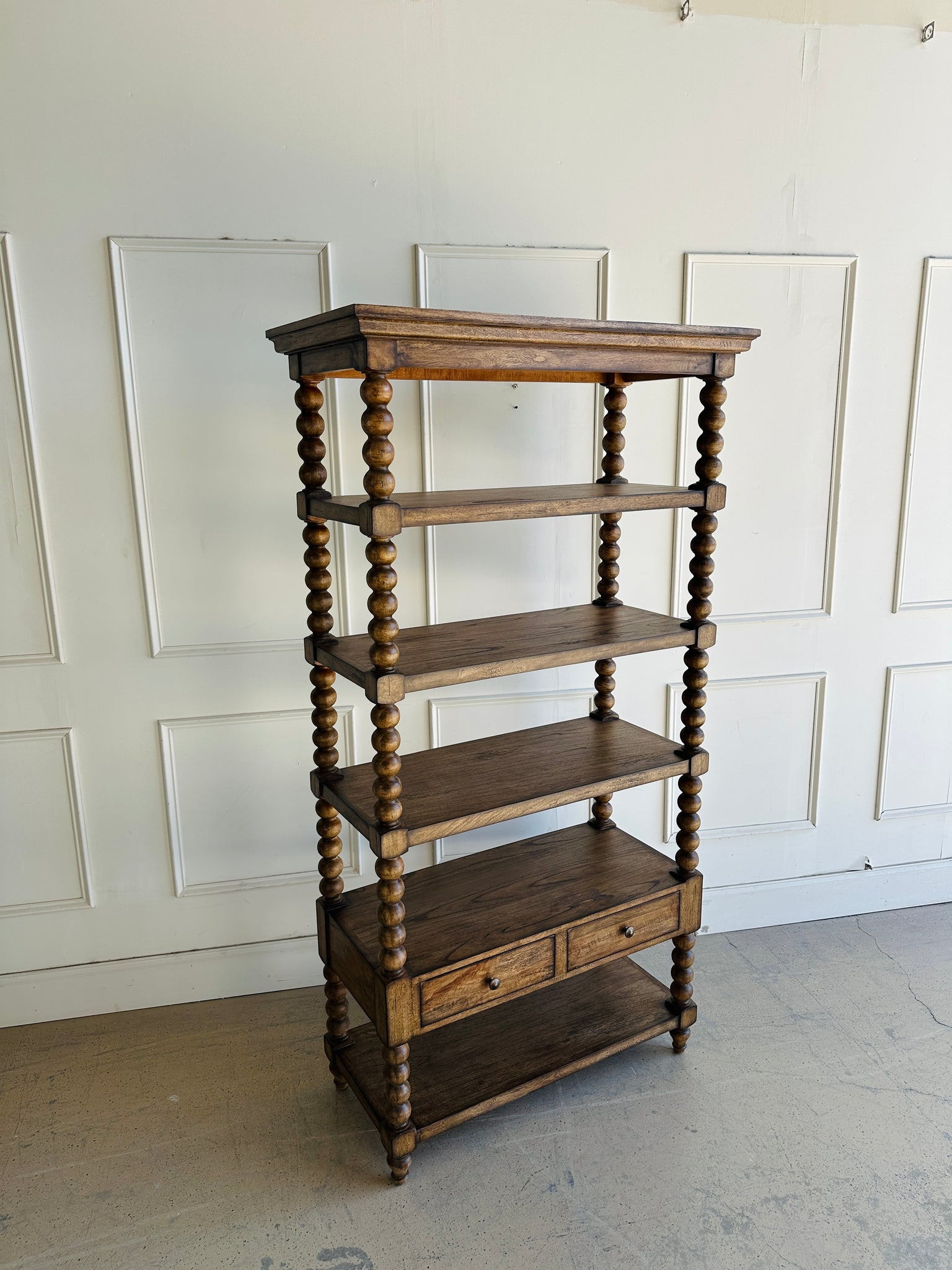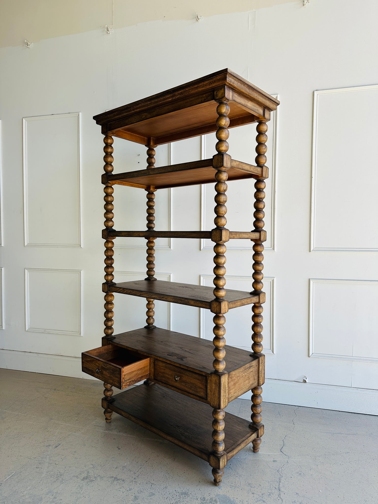 The Wellmington Bookcase turns blank walls into a curated focal point. Handcrafted from solid mango wood, it balances architectural presence with everyday utility: bold bobbin-turned legs frame generous open shelving, while a full lower tier and two neatly fitted drawers keep smaller items out of sight. Shown in our warm Rustic Pecan finish, it brings texture and warmth to living rooms, dining spaces, libraries, and home offices—and can just as easily anchor a styled entry.