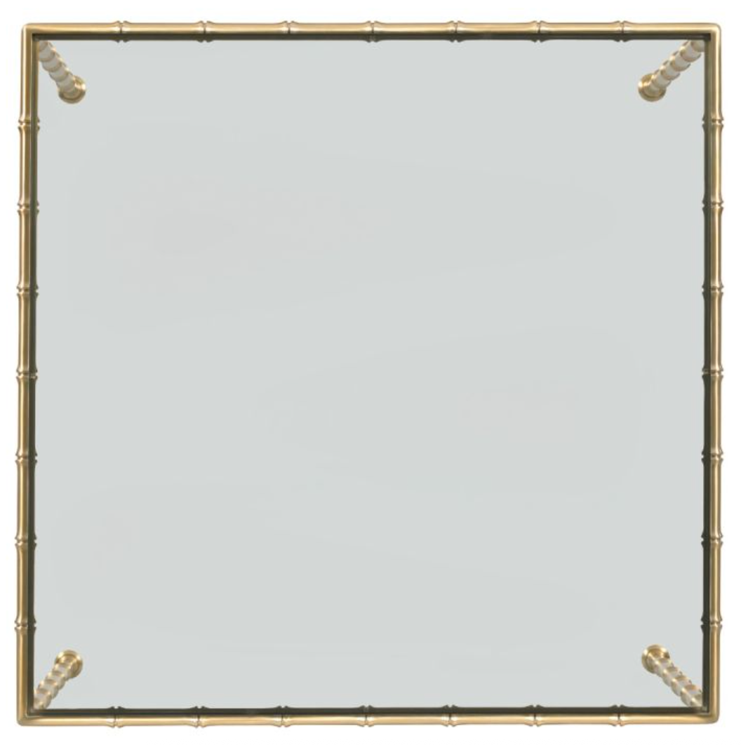 This amazing showroom sample is in like new condition. Channeling the sophistication of 19th-century English Regency design, the Lacoste Game Table adds a touch of timeless glamour to any setting. Its square top is inset with 3/8" tempered glass, offering both clarity and durability, while the frame and legs—cast in brass with faux bamboo turning—bring subtle ornamentation and a warm golden glow.